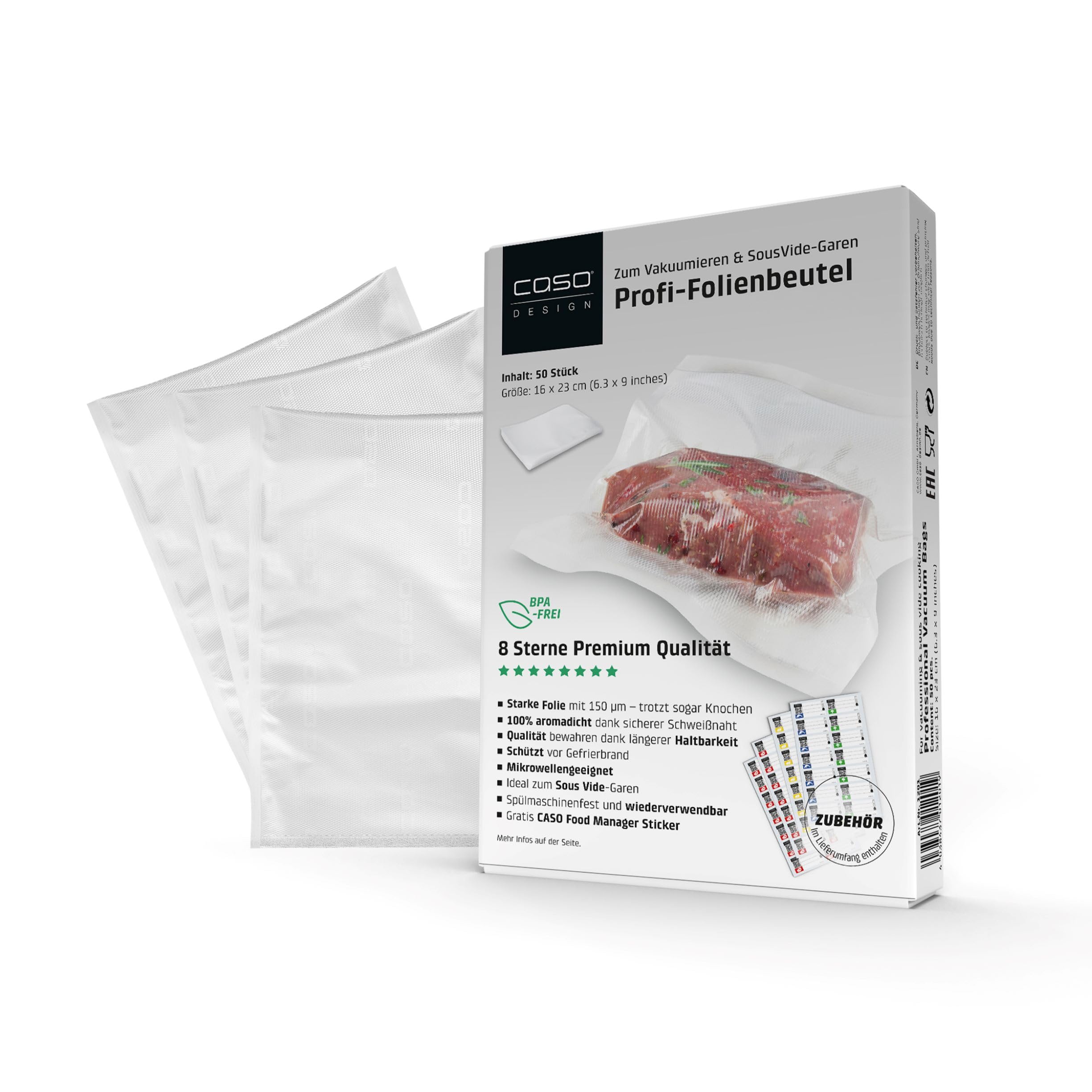 CASO Profi- Folienbeutel 40x60 cm / 25 Beutel, für alle Vakuumierer, BPA-frei, sehr stark & reissfest ca. 150µm, aromadicht, kochfest, Sous Vide, wiederverwendbar, inkl. Food Manager Sticker