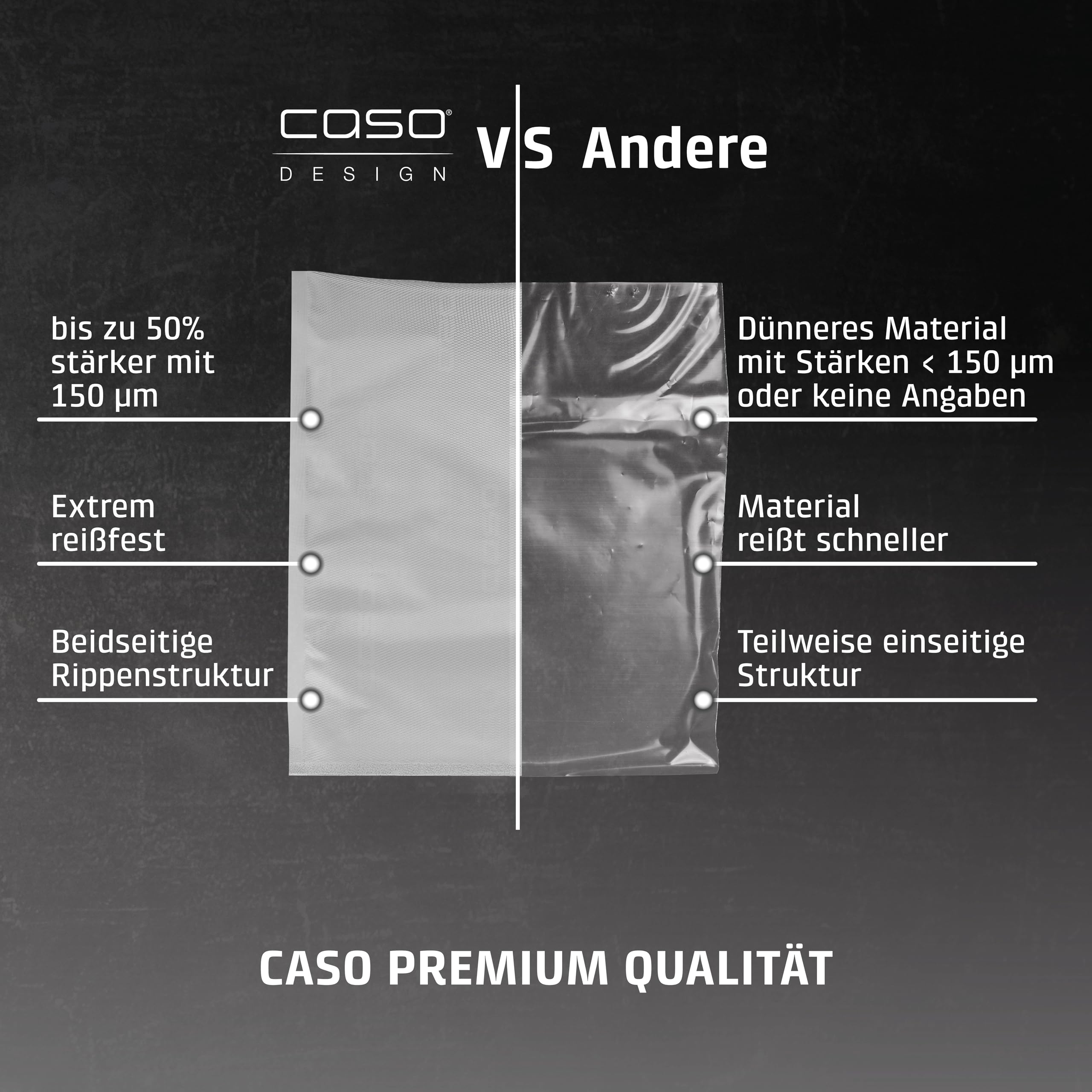 Vakuumiert bleiben Ihre Lebensmittel bis zu 8x länger frisch als bei herkömmlichen Aufbewahrungsmethoden, ganz natürlich - ohne Konservierungsstoffe. Starten Sie die Frische- Offensive und geniessen Sie optimalen Geschmack und volle Vitamine einfach länger wie bisher. Einfach ideal für Fleisch, Fisch, Obst oder Gemüse. Gross kochen, klein portionieren. Nutzen Sie Angebote aus und portionieren und vakuumieren Sie z. B. frisches Fleisch oder Obst und sparen Sie somit bares Geld und Zubereitungszeit ein. Einfach ideal für die Portionierung und lange Lagerung von Lebensmitteln oder das Kochen à la Sous Vide. Geeignet für alle CASO Vakuumierer und für die Marken FreshVAC, WMF, Rommelsbacher, LAICA, Gastroback, Foodsaver, Solis, Steba, Lava, Ohmex, Flame Nuova uvm.
