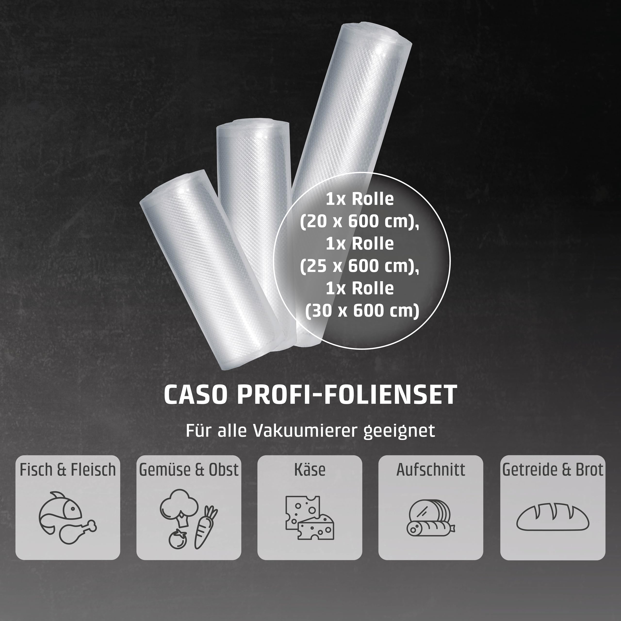 CASO Profi- Folienset 4, 3x Folienrolle (1x20x600cm, 1x25x600cm, 1x30x600cm), Vakuumierbeutel, Vakuumbeutel für Lebensmittel, reissfest 150µm, Vakuumierfolie Sous Vide, BPA-frei