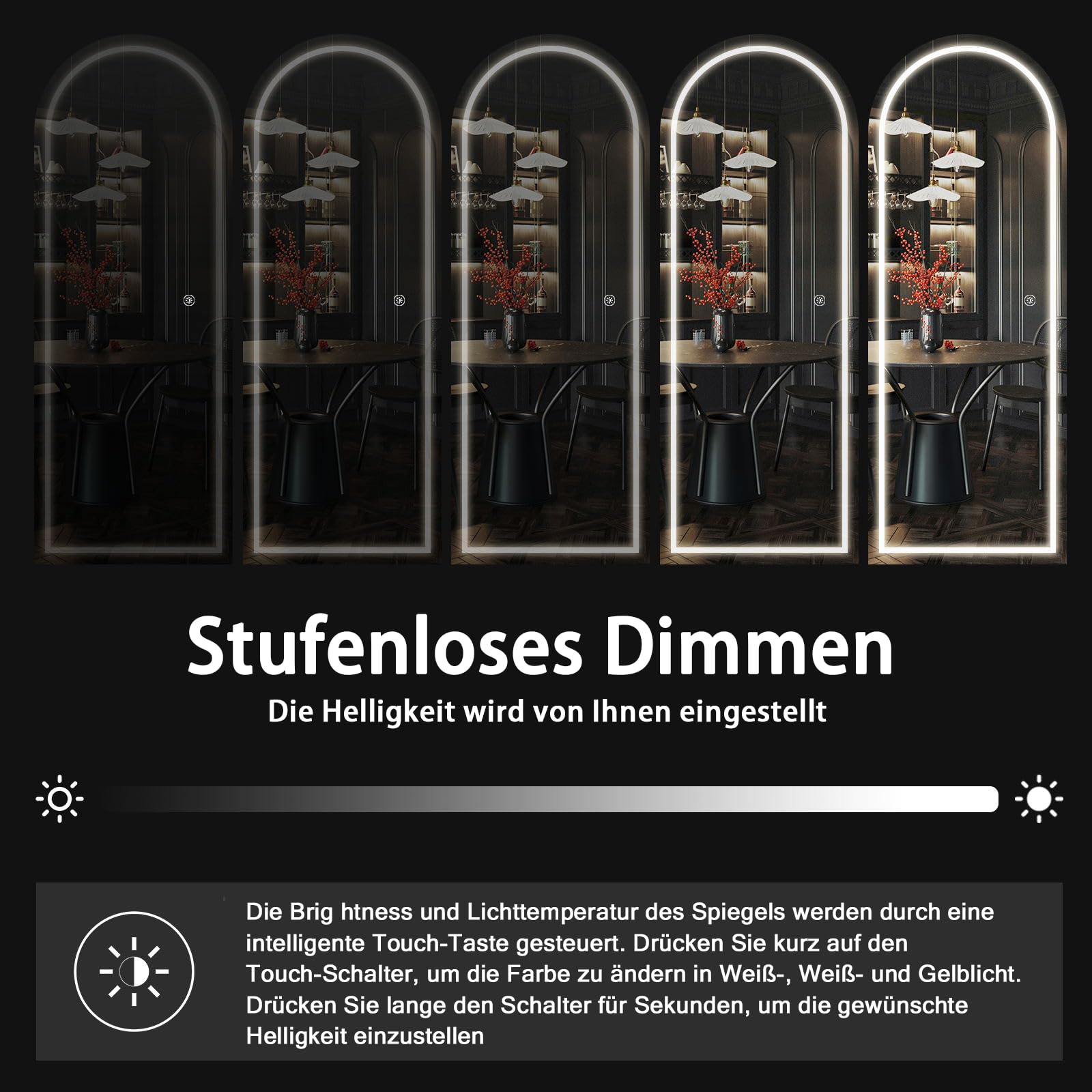 - 【3 Farbdimmbarer Spiegel mit Licht】Smart Touch-Tastensteuerung, einfach zu bedienen, können Sie mühelos zwischen Beleuchtungsmodi wechseln und Helligkeitsstufen mit den Touchscreen-Tasten bequem auf dem Spiegel anpassen. Ausgestattet mit warmem Licht, natürlichem Licht und kühlem Licht, erfüllt dieser Spiegel alle Ihre täglichen Bedürfnisse, ob für einen lässigen Ausflug, eine Date-Nacht oder professionelle Einstellungen