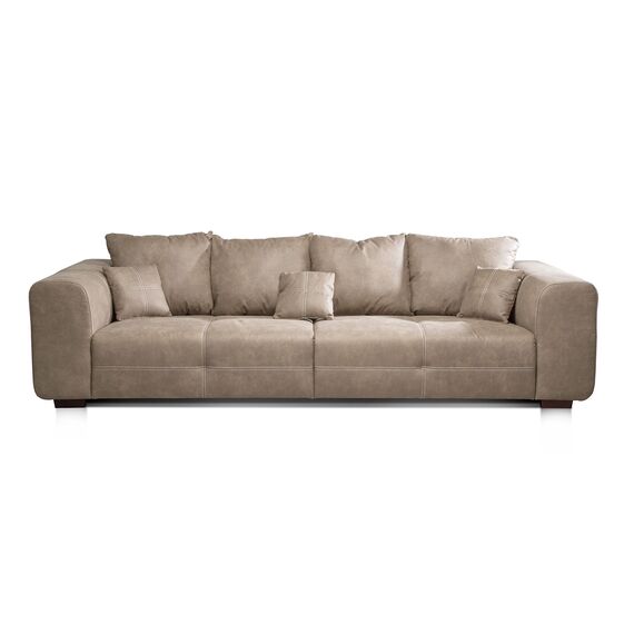 Cavadore Mavericco – Moderne Wohnzimmermöbel mit Liebe zum Detail Ob als Big Sofa oder als Ecksofa, die Polstergarnitur Mavericco besticht mit einer aufwendigen Verarbeitung und einem zeitlosen Design. Ein passender Hocker ist ebenfalls erhältlich.Eigenschaften:Modernes Polsterprogramm mit aufwendiger Verarbeitung und hoher QualitätMikrofaser mit Prägung in Lederoptik mit Zweinadel-Steppung in einem beigen KontrastgarnFrei im Raum stellbarMaterialien:Bezogen mit strapazierfähiger Mikrofaser mit Prägung „Preston“ (100 % Polyester)Gestell: Massivholz und SpanplattenPolsterung Sitz: Wellenunterfederung, Filz, PUR-Schaum, WatteabdeckungPolsterung Rücken: Gummigurte, PUR-Schaum, Watteabdeckung, alle Elemente Rücken echtFuss: Holzfüsse in Buche Antik nussbaumfarben Masse Big Sofa:Breite: ca. 287 cm Höhe: ca. 69 cm (mit Rückenkissen ca. 88 cm)Tiefe: ca. 108 cmSitzhöhe: ca. 42 cmSitztiefe: ca. 62 cm Masse mit Verpackung:Colli 1: ca. 148 x 94 x 110 cm (BxHxT)Colli 2: ca. 148 x 94 x 110 cm (BxHxT)Pflegehinweise:Sorgfältig entstaubenMit einem weichen, sauberen, feuchten Tuch und leichter Seifenlauge reinigenNicht zu nass abwischenReinigen ohne Scheuermittel wie Pulver, Stahlwolle oder LösungsmittelMontageanleitung ist beigefügt.Lieferumfang: Cavadore 503 - Big Sofa Mavericco mit Kontrastnaht in Beige / Inkl. 4 Rückenkissen (65 x 55 cm) und 3 Zierkissen (35 x 35 cm) im Polsterstoff des Sofas / Nussbaumfarbene Holzfüsse in Buche Antik