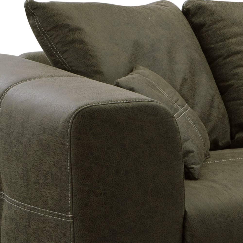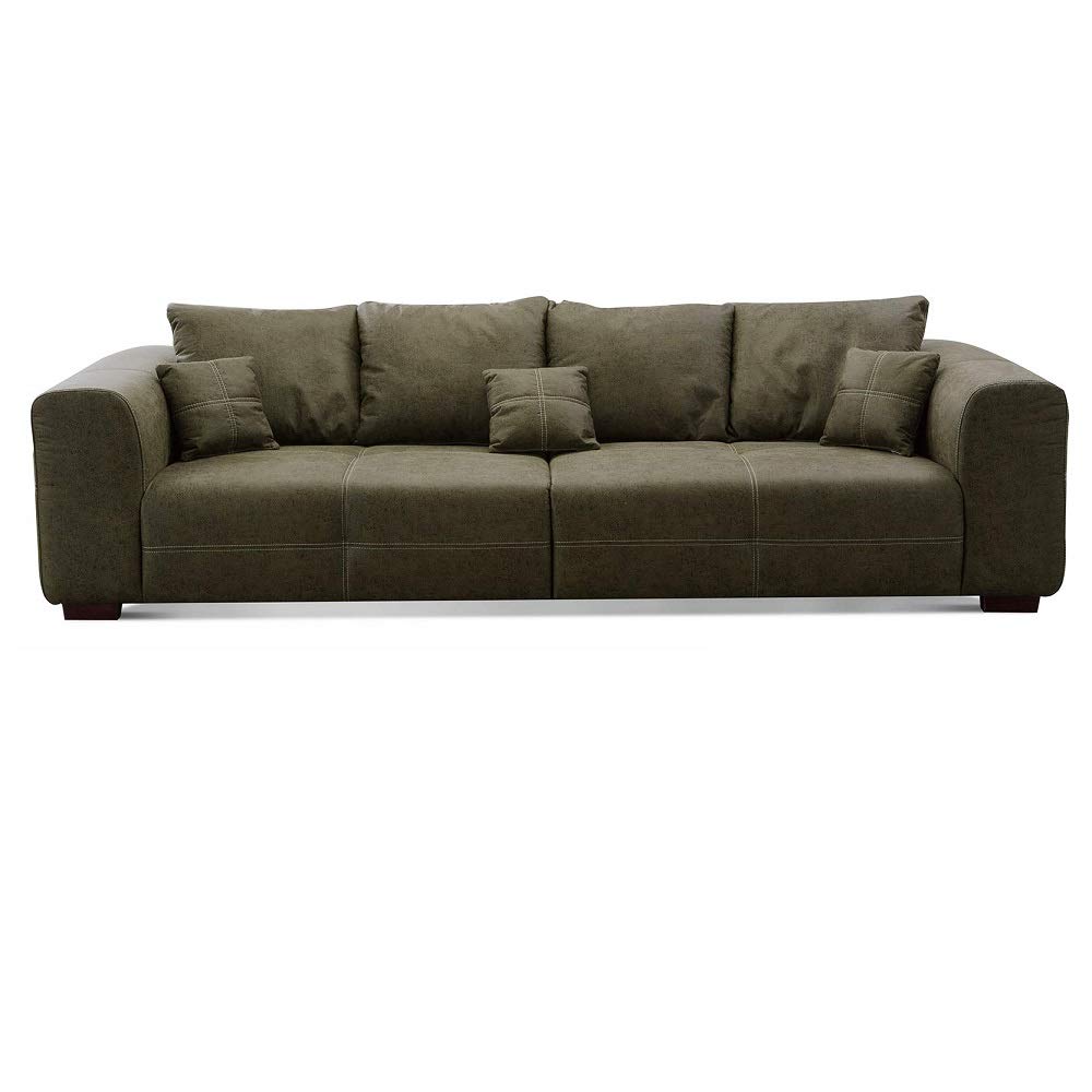 Cavadore Mavericco – Moderne Wohnzimmermöbel mit Liebe zum Detail Ob als Big Sofa oder als Ecksofa, die Polstergarnitur Mavericco besticht mit einer aufwendigen Verarbeitung und einem zeitlosen Design. Ein passender Hocker ist ebenfalls erhältlich.Eigenschaften:Modernes Polsterprogramm mit aufwendiger Verarbeitung und hoher QualitätMikrofaser mit Prägung in Lederoptik mit Zweinadel-Steppung in einem beigen KontrastgarnFrei im Raum stellbarMaterialien:Bezogen mit strapazierfähiger Mikrofaser „Taurus“ in Büffellederoptik (100 % Polyester)Gestell: Massivholz und SpanplattenPolsterung Sitz: Wellenunterfederung, Filz, PUR-Schaum, WatteabdeckungPolsterung Rücken: Gummigurte, PUR-Schaum, Watteabdeckung, alle Elemente Rücken echtFuss: Holzfüsse in Buche Antik nussbaumfarben Masse Big Sofa:Breite: ca. 287 cm Höhe: ca. 69 cm (mit Rückenkissen ca. 88 cm)Tiefe: ca. 108 cmSitzhöhe: ca. 42 cmSitztiefe: ca. 62 cm Masse mit Verpackung:Colli 1: ca. 112 x 148 x 72 cm (BxHxT), Gewicht: ca. 44 kgColli 2: ca. 112 x 148 x 72 cm (BxHxT), Gewicht: ca. 44 kgPflegehinweise:Sorgfältig entstaubenMit einem weichen, sauberen, feuchten Tuch und leichter Seifenlauge reinigenNicht zu nass abwischenReinigen ohne Scheuermittel wie Pulver, Stahlwolle oder LösungsmittelMontageanleitung ist beigefügt.Cavadore 503 - Big Sofa Mavericco mit Kontrastnaht in Beige / Inkl. 4 Rückenkissen (65 x 55 cm) und 3 Zierkissen (35 x 35 cm) im Polsterstoff des Sofas / Nussbaumfarbene Holzfüsse in Buche Antik