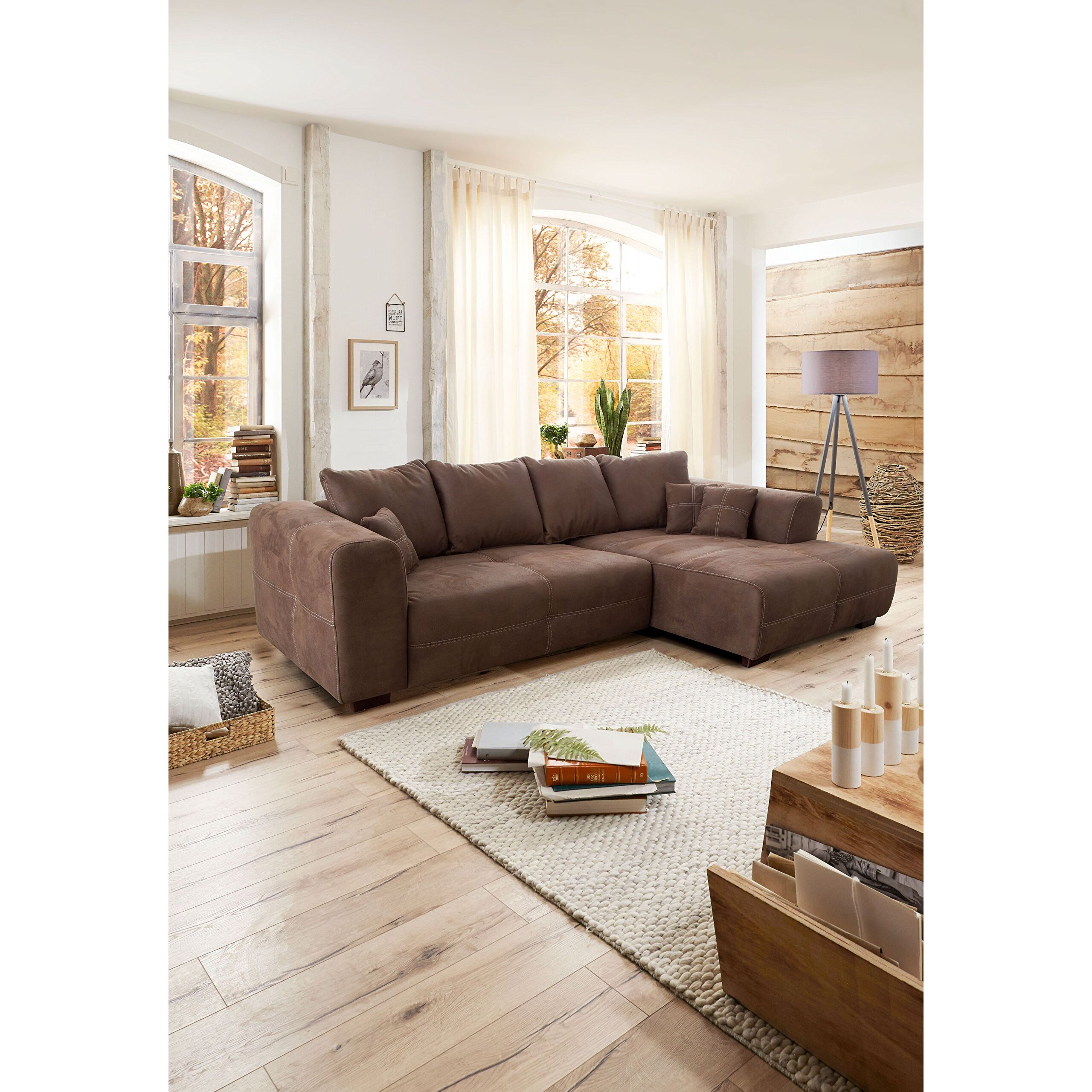 Cavadore Ecksofa Mavericco / XXL Eckcouch Inkl. Rückenkissen und Zierkissen / Longchair rechts / Industrial Style / 285 x 69 x 170 (BxHxT) / Mikrofaser Braun