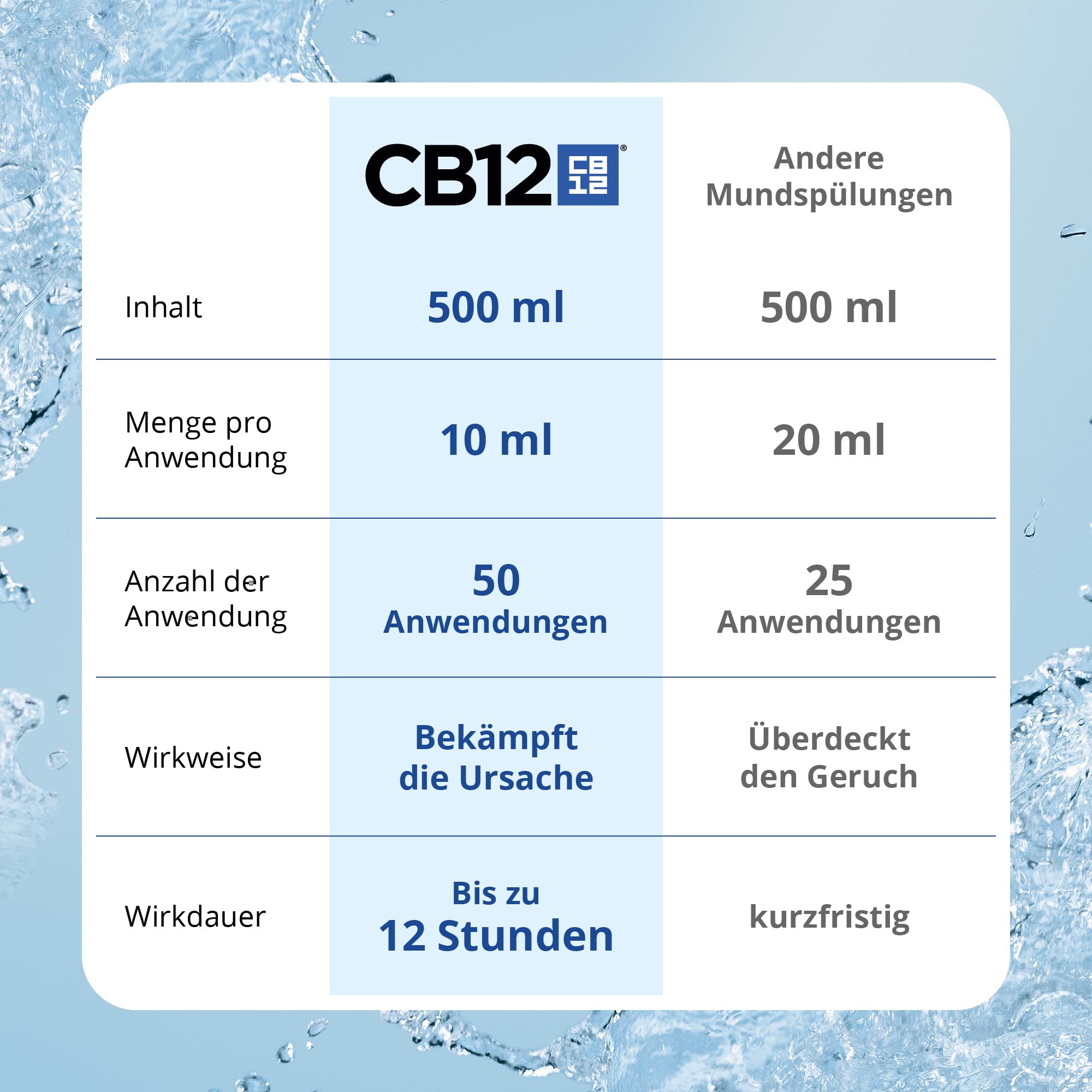 Schlechter Atem und Zahnverfärbungen können das Leben negativ beeinträchtigen. Wussten Sie, dass fast jeder Zweite an Mundgeruch leidet? Unzureichende Mundhygiene, färbende Lebensmittel und Getränke, Zigaretten, Zahnfleischentzündungen und Krankheiten (Gingivitis und Parodontitis), Stress und hormonelle Veränderungen können Ursachen für Mundgeruch sein. Die Bakterien im Mund setzen, flüchtige Schwefelverbindungen frei, was zuMundgeruch führt. CB12 bekämpft die Ursache des Problems, statt den Geruch nur zu überdecken, wie herkömmliche Mundspülungen. Zusätzlich zu der lang anhaltenden Wirkung bis zu 12 Stunden ist die einzigartige Formel reich an Fluorid, das die Festigkeit Ihrer Zähne erhöht. 2,3 Spülen Sie morgens und abends nach dem Zähneputzen mit 10 ml für 30 bis 60 Sekunden. Zusätzlich hellen Sie Ihre Zähne sichtbar auf – nach nur 2 Wochen. Kann zusammen mit CB12 Boost (Kaugummis) oder CB12 Spray verwendet werden. 1. Wissenschaftlich nachgewiesener 12-Stunden-Effekt: vgl. Studien von Seeman et al. J Breath Res. 2016, 22. Juni; 10(3): 036002, doi: 10.1088/1752-7155/10/036002 Thrane P.S., Young A., Jonski G. et al. J Clin Dent 2007;18(3):82-6. 2. Marinho V.C., Chong L.Y., Worthington H.V., Walsh T. Fluoride for strengthening of teeth: Cochrane Database Syst Rev. 2016 Jul 29;7:CD002284. doi: 10.1002/14651858.CD002284.pub2. 3. Reich E. et al. Mouthrinses and dental caries. International Dental Journal (2002) 52: 337-345.
