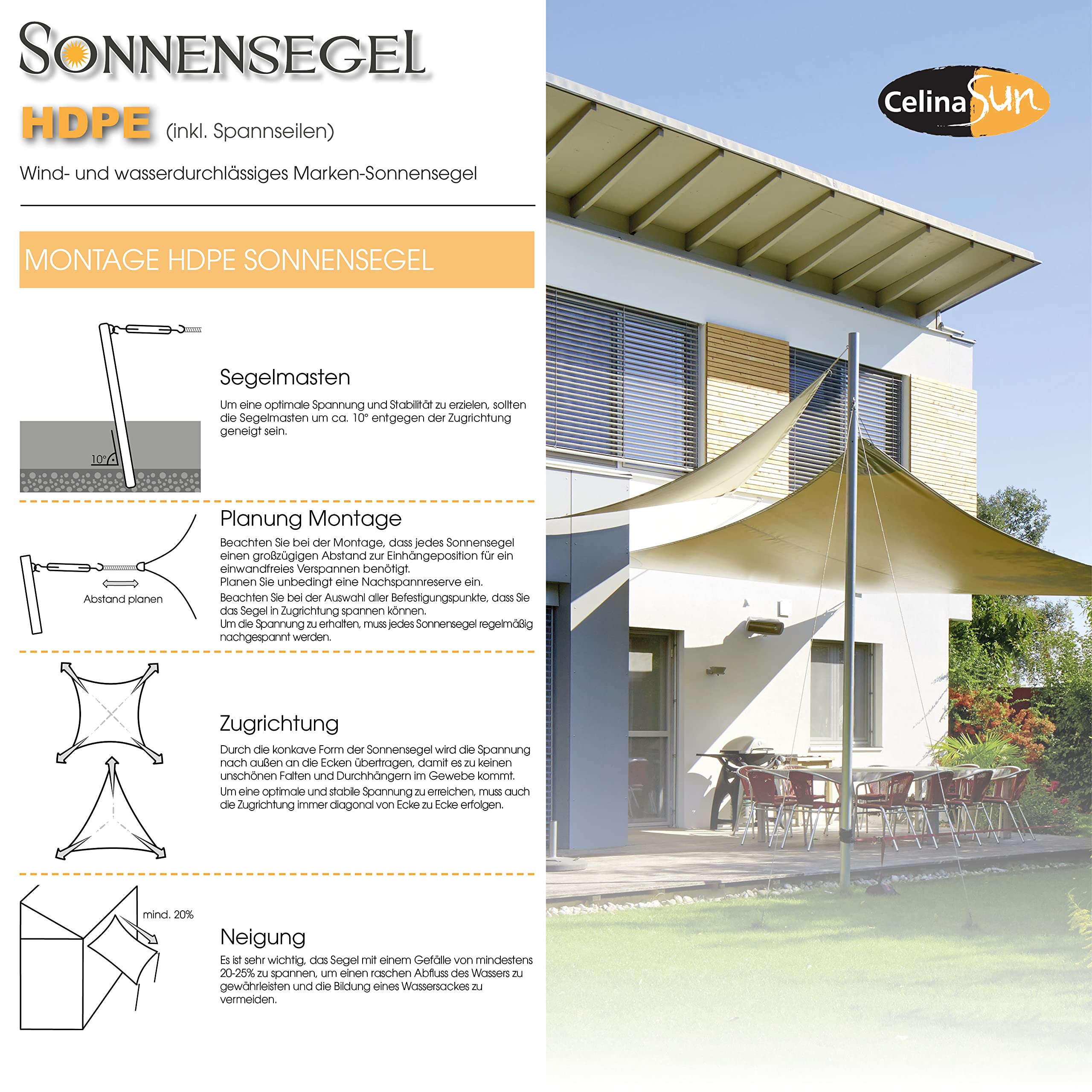 Das Sonnensegel von CelinaSun ist ideal für Schatten im Sommer. Auf der Terrasse, dem Balkon oder beim Camping lässt er sich überall schnell und einfach installieren. Unser Segel.