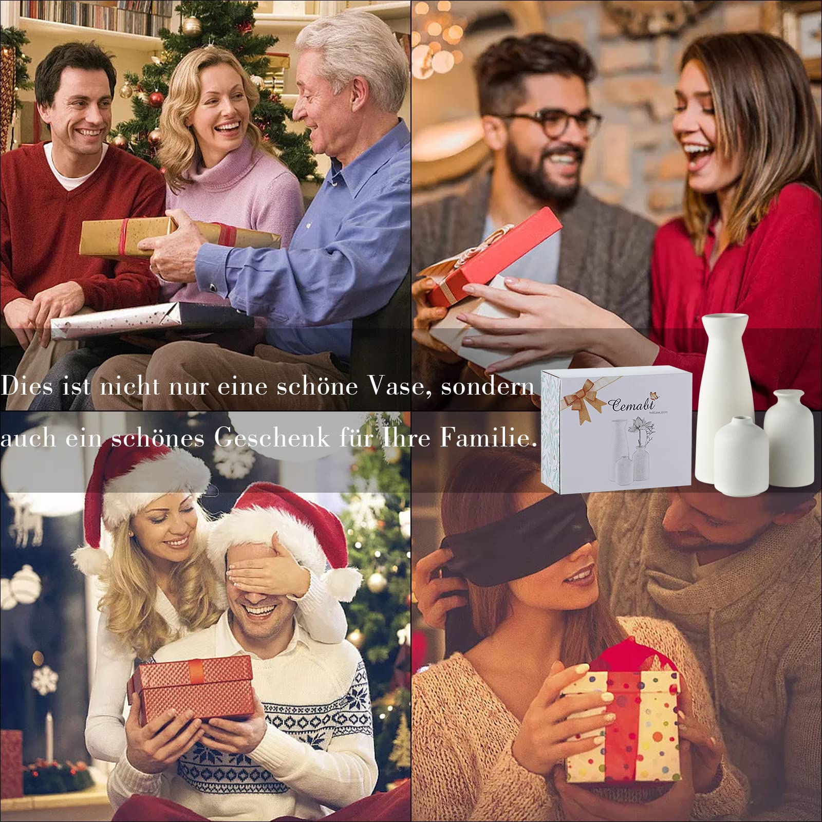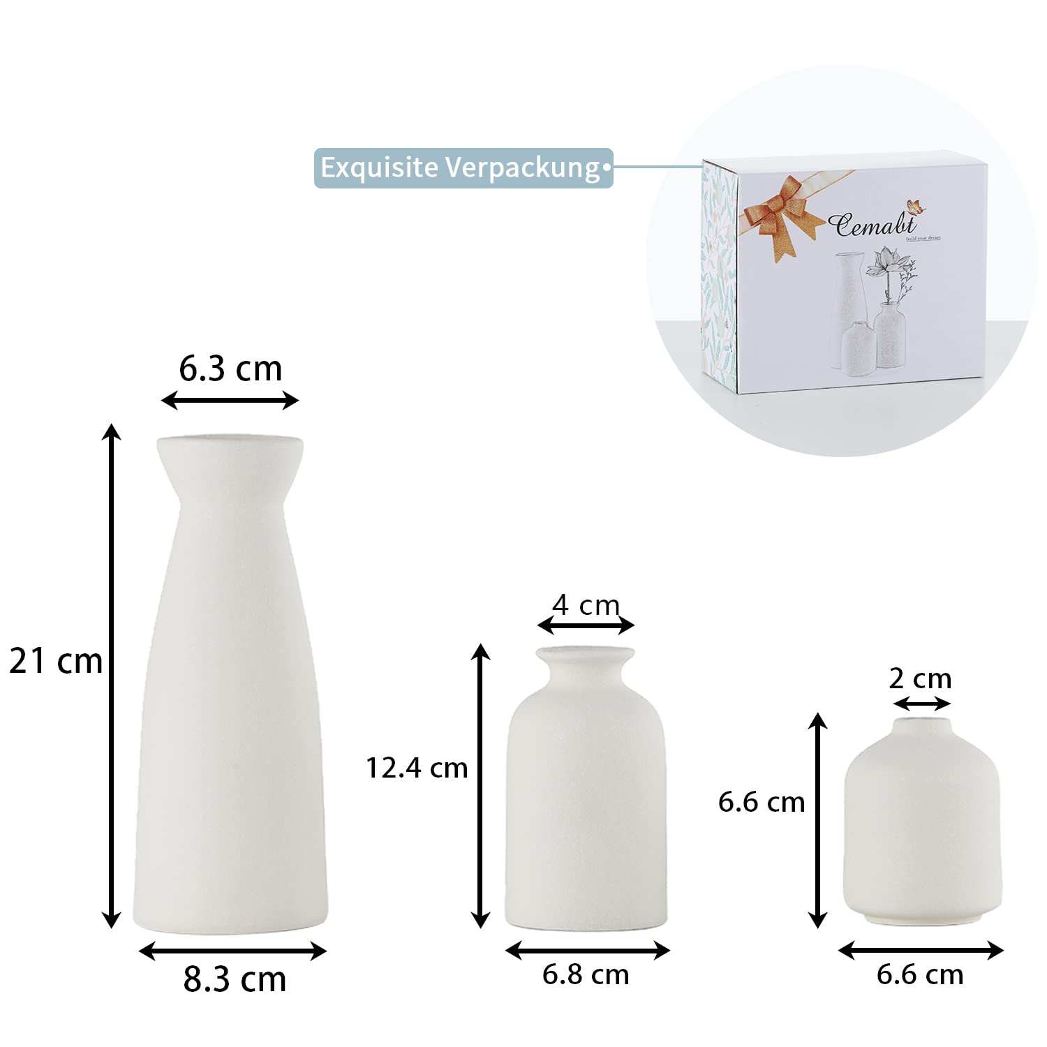 MINIMALISTISCHES DESIGN Dieses weisse Vasenset mit 3 Vasen wurde in Neuseeland entworfen und besteht zu 100 % aus Keramik, die bei intensiven Temperaturen gebrannt wird, um ihnen ein robustes und langlebiges Aussehen zu verleihen. MEHRZWECK Dieses weisse Keramikvasen-Set dient als dekorativer Akzent und eignet sich perfekt zum Aufbewahren von Blumen, Pampasgras, Trockenblumen, künstlichen Blumen, Stielen und Blumensträussen für einen Farbtupfer. Vielseitig einsetzbar: Dieses dekorative Vasen-Set ist vielseitig einsetzbar. Perfekt für Ihr Bücherregal, Ihren Couchtisch, Ihre Tischplatte, Ihr Regal, Ihr Bauernhaus, Ihren Kamin oder Ihren Esstisch. [Produktgrösse] Jede kleine Vase variiert in der Grösse von 8,3 H x 3,1 B (Pampasvase), 4,9 H x 2,8 B (kleine Vase), 4 H x 2,8 B (kleine Vase), 4 H x 2,8 W (Knospen. Kleines Vasen-Set, nicht gross. PERFEKTES GESCHENK Perfektes Geschenk für Muttertag, Erntedankfest, Jubiläen, Hochzeiten oder Einweihungsfeiern. Weisse Keramikvasen von CEMABT, 3er-Set, kleine Blumenvasen zur Dekoration, moderne rustikale Bauernhaus-Heimdekoration , Dekorative Vasen für Pampasgras und Trockenblumen, Ideenregal, Tisch, Bücherregal, Garderobe. MINIMALISTISCHES DESIGN. Dieses weisse Vasenset aus 3 Vasen wurde in Neuseeland entworfen. Sie bestehen zu 100 % aus Keramik, die bei intensiven Temperaturen gebrannt wurde, um ihnen eine stabile Form zu verleihen und langanhaltende Wirkung. Dieses weisse Keramikvasen-Set dient als dekorativer Akzent und eignet sich perfekt zum Präsentieren von Blumen, Pampasgras, Trockenblumen, künstlichen Blumen, Stielen und Blumensträussen für einen Hauch von Farbe Das Set kann auf viele verschiedene Arten verwendet werden. Perfekt für Ihr Bücherregal, Ihren Couchtisch, Ihre Tischplatte, Ihr Regal, Ihr Bauernhaus, Ihren Kamin oder Ihren Esstisch. PRODUKTGRÖSSE Jede kleine Vase variiert in der Grösse von 8,3 Zoll