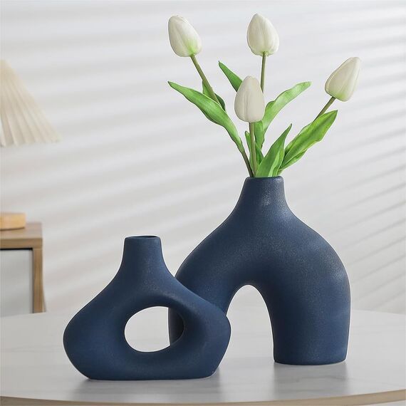 CEMABT Blau Keramikvase 2er Set für Moderne Wohnkultur, runde Matte Donut-Vasen für Pampasgras, neutraler Boho-nordischer Minimalismus-Stil Blumenvasen für Wohnzimmer Hochzeit