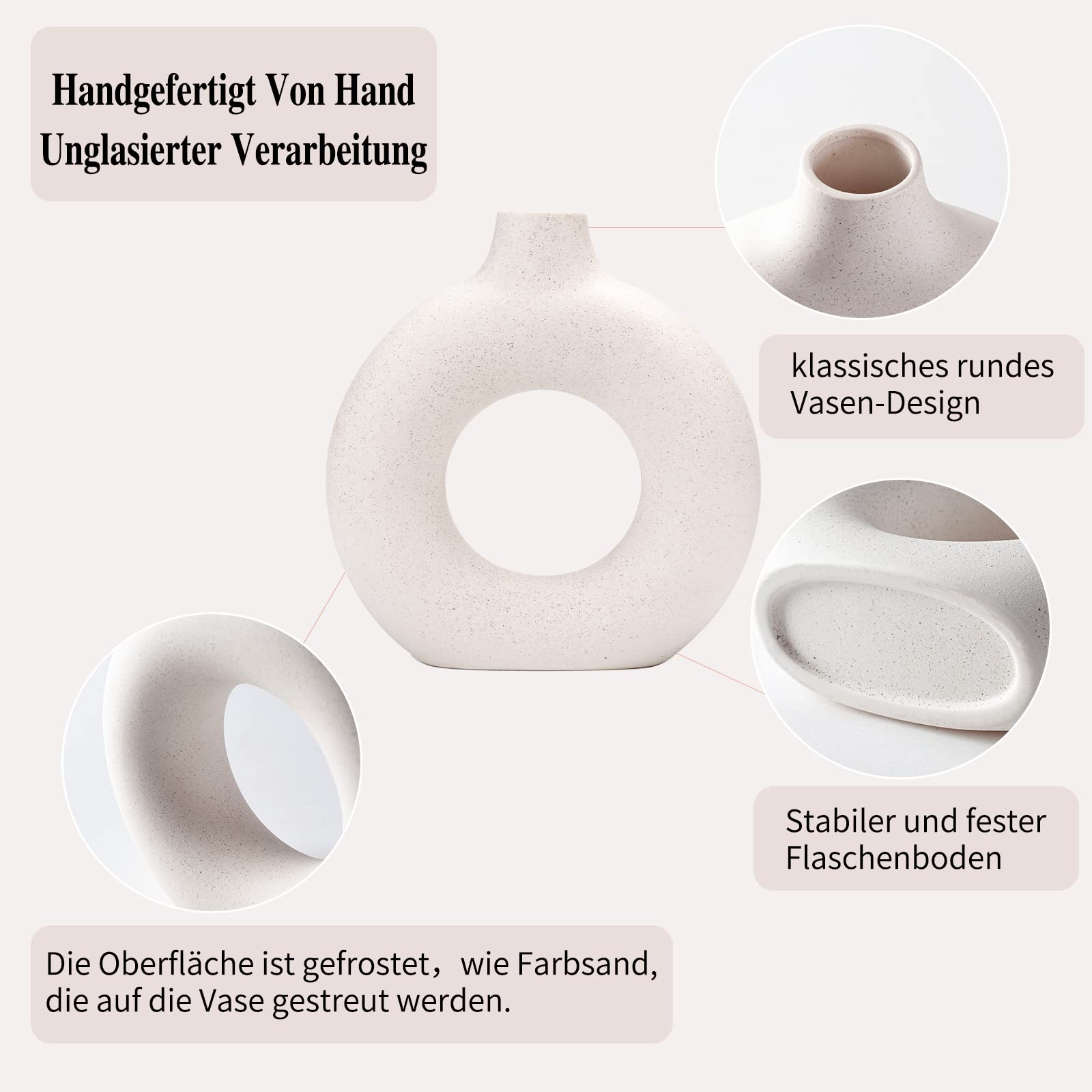 - 【Donut-Design】Die dekorative Vase ist mit einer einzigartigen Donutform gestaltet, die sich von der traditionellen Vase unterscheidet. Das ausgehöhlte Zentrum macht sie nicht nur zu einer Blumenvase, sondern auch zu einem Kunstwerk.