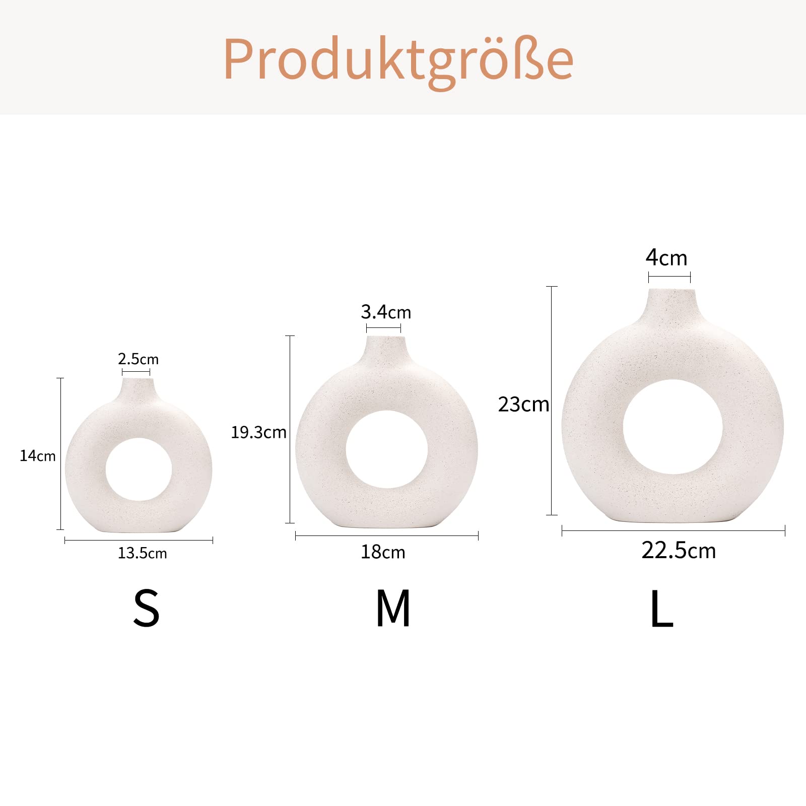 Perfekte Grösse: S: 5,3 × 5,5, ø: 0,98 Zoll, M: 7x 7,4, ø: 1,3 Zoll, L: 8,8 × 9, ø: 1,5 Zoll (wir ver nur Vasen). Die Porzellanvase in mattem Weiss mit toller Struktur besteht aus hochwertigem, stabilem Porzellan. Die Vase hat eine raue, matte Optik und sieht sehr elegant aus. Donut-Design: Die dekorative Vase hat eine einzigartige Donut-Form, die sich von der traditionellen Vase unterscheidet. Die ausgehöhlte Mitte macht sie nicht nur zu einer Blumenvase, sondern auch zu einem Kunstwerk. Elegant und zeitlos: Dank seines schlichten Designs passt es perfekt zu jeder Wohneinrichtung – ob Boho, Scandi oder Modern. Das Design ist sehr minimalistisch und basiert auf organischen Formen und natürlichen matten Farben. Einfaches und einzigartiges abstraktes Design, das die Vase mit oder ohne Blumen wunderschön macht. Es verleiht Ihrem Zuhause ein stilvolles und künstlerisches Aussehen. Handgefertigte Vasen: ein exquisites Kunstwerk. Diese Vase ist ein ideales Geschenk für Familie und Freunde. Es eignet sich besonders für Menschen, die einzigartige dekorative Vasen und moderne Vasen mögen. Es ist eine gute Wahl für den persönlichen Gebrauch oder für Freunde und Familie