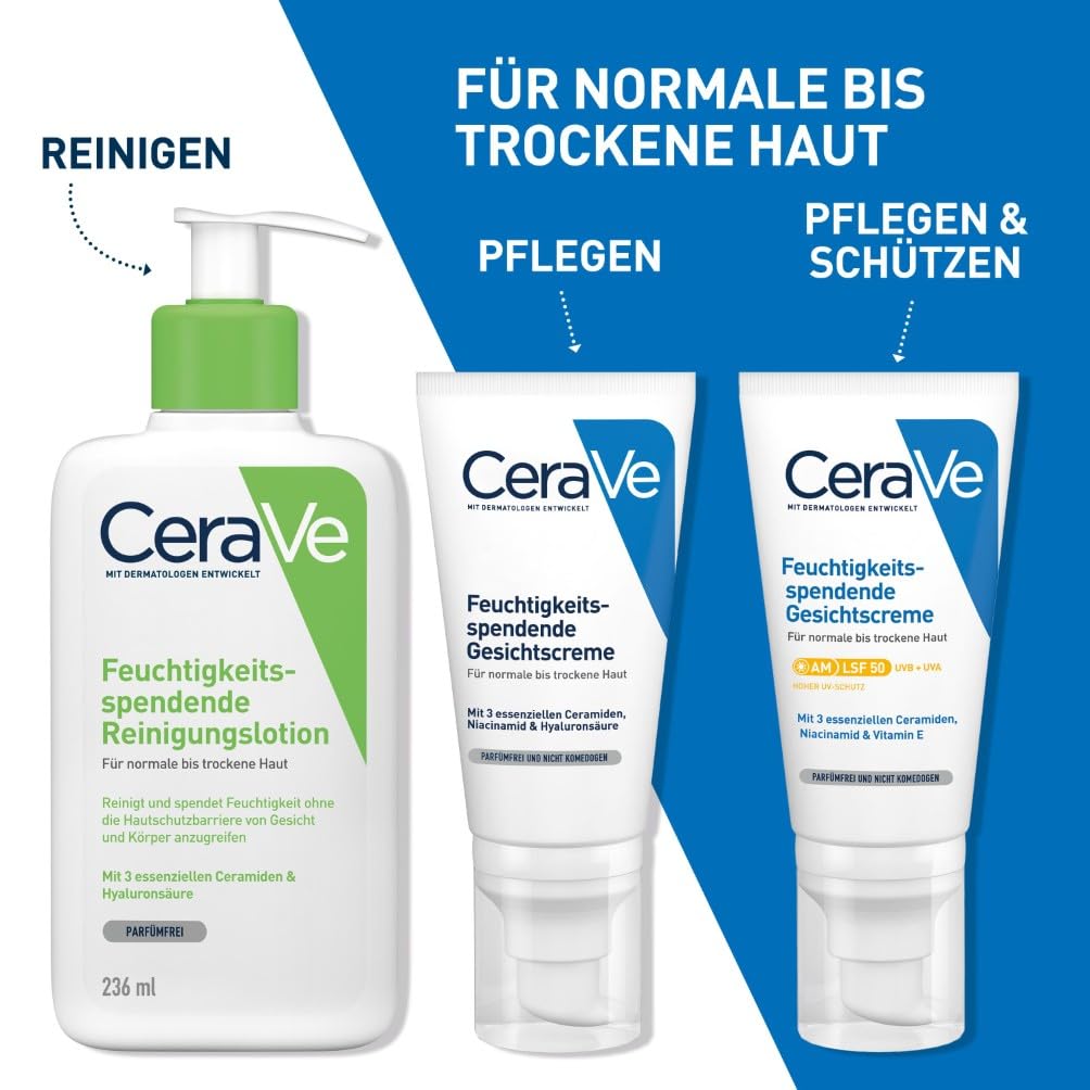 Die CeraVe Feuchtigkeitscreme für das Gesicht mit LSF 50 bietet einen umfassenden Schutz und intensive Pflege für trockene bis sehr trockene Haut. Entwickelt mit Dermatologen, kombiniert diese Tagespflege drei essenzielle Ceramide, Hyaluronsäure und Niacinamid, um die Hautbarriere zu stärken und langanhaltende Feuchtigkeit zu spenden.