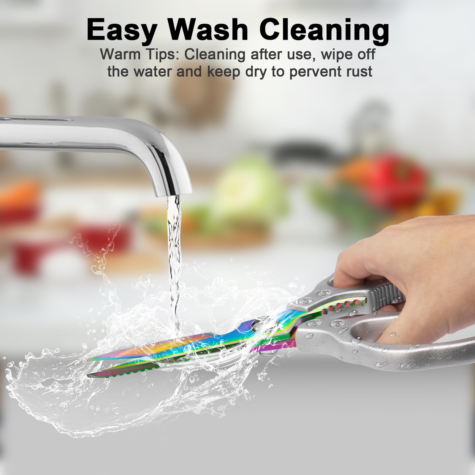 - 【MULTIFUNKTIONALE KÜCHENSCHERE】Neben der Standard-Küchenschere gibt es auch spezielle Scheren für Geflügel, Fisch und Kräuter. Enthält zusätzliche Funktionen wie einen Flaschenöffner, einen gezahnten Griff zum Knacken von Knochen und Nüssen, Kerben an den Griffen zum Öffnen von Gläsern und eine Schraubendreher-Spitze.