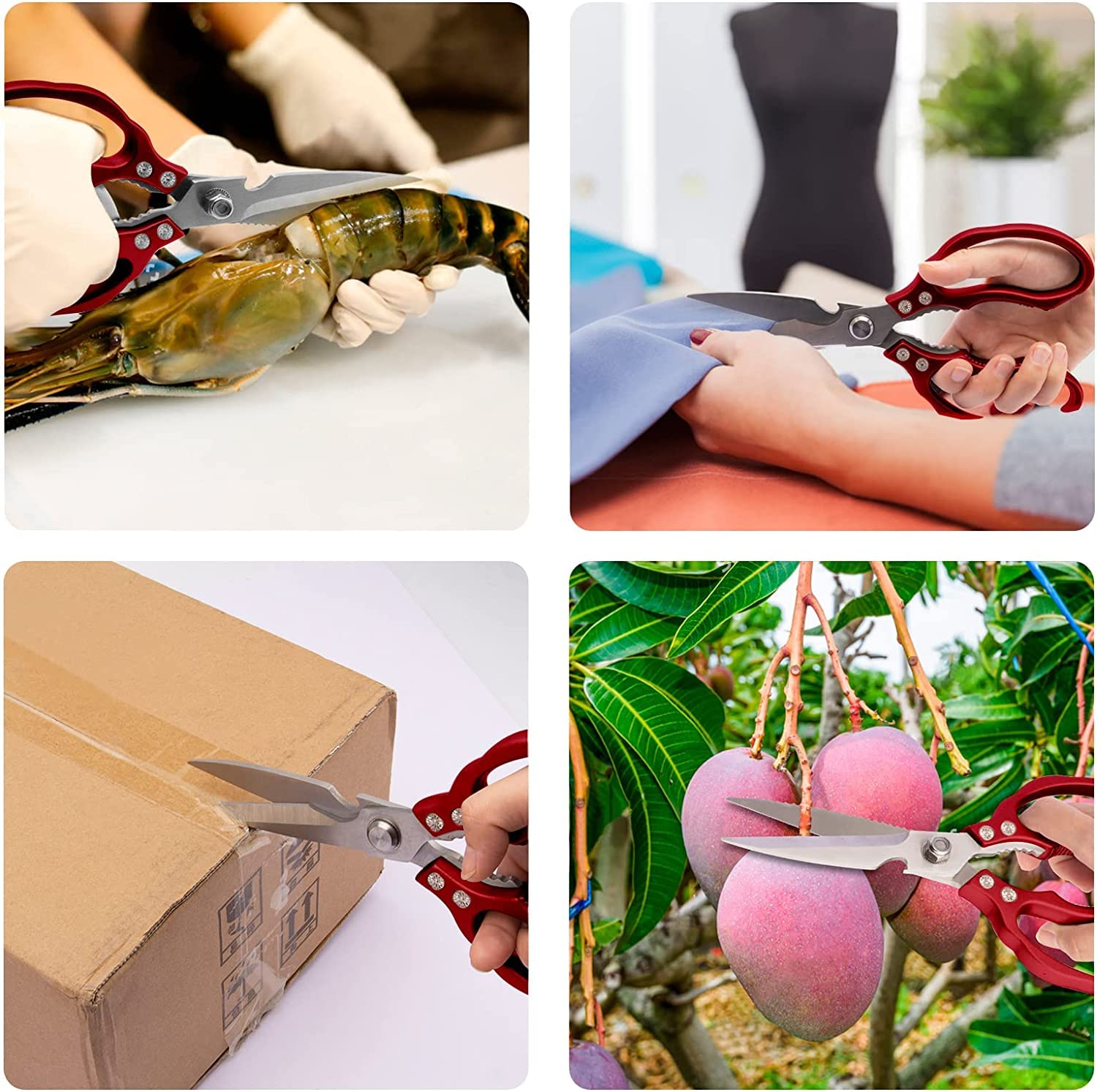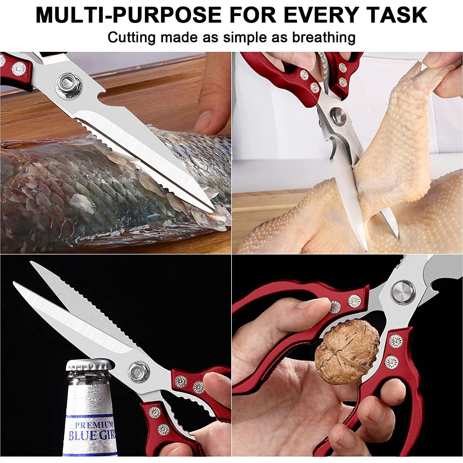 - 【EDELSTAHL SCHARFE KLINGEN】 Hochwertige gehärtete Edelstahlklingen schneiden leicht durch Pappe, Schnur, Lebensmittel, Fleisch, Gemüse, Huhn, Geflügel, Fisch, Kräuter, Meeresfrüchte, BBQ, Lebensmittelverpackungsbeutel und mehr. Ideal als Lebensmittelschere, Fleischschere, Küchenschere, Kochschere, Geflügelschere, Nutzschere, Fleischschneideschere.