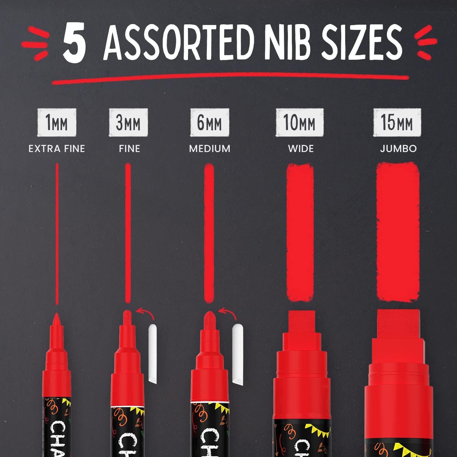 Chalkola Kreidestifte - Rot- 5 Kreide Markers Multipack - 1mm, 3mm, 6mm, 10mm, 15mm Spitze. Kreidestifte für Fenster, Tafel, Glas und mehr. Ideal für Erwachsene, Künstler, Lehrer und Kinder.