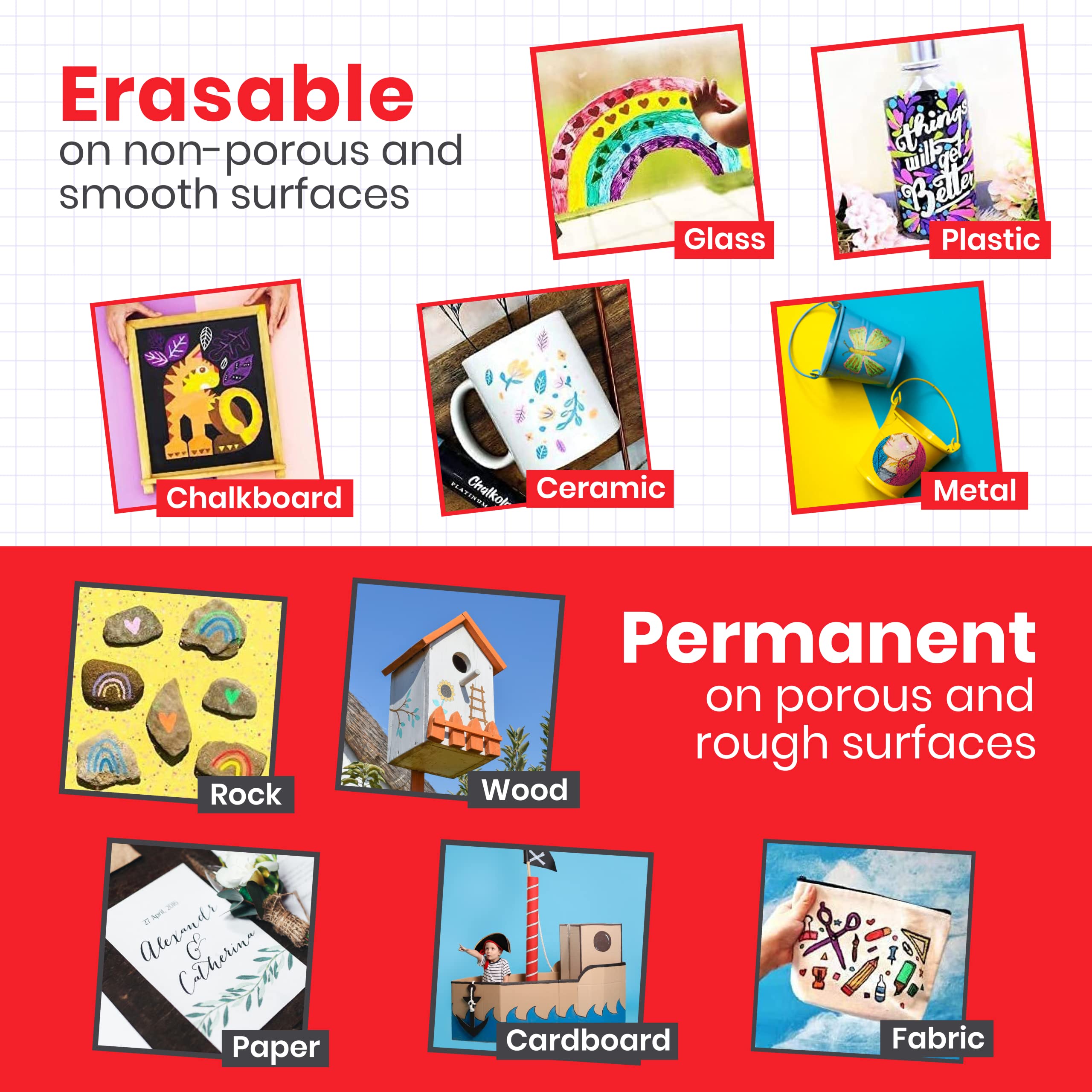 Der Marker helfen Ihnen durch lebhafte Farben jedes Kunstwerk zu verschönern und aufzuhellen! Vertrauensvollste & durch Künstler, Handwerker und Eltern in den USA weit verbreitete Marke. Ersetzen Sie die normale Kreide, welche zu staubiger, stumpfer kreativer Kunst führt. Diese Stifte sind eine grossartige Option, wenn Sie dickgedruckte und weiche Buchstaben möchten, die nicht verschmieren. Man kann einfach mit ihnen schreiben und sie können zu unterschiedlichen Gelegenheiten genutzt werden: fvr Projekte mit Kindern, Brainstorming Ideen am Arbeitsplatz, Café Menü, Nachrichtentafel, kreative Kunst zu Hause, für alle kommerziellen Anwendungen, Autofenster, glatte Klassenzimmertafeln, Lehrmittel und sie werden von Müttern geliebt! Ein Marker kann als Gastgebergeschenk bei Kindergeburtstagen, für Partydekorationen oder als Geburtstagsparty-Zubehör genutzt werden. Genauso gut kann er bei besonderen festlichen Dekorationen eingesetzt werden: Ostern, Mutter- & Vatertag, Halloween, 4. Juli. Die Tinte trocknet komplett zu einer Farbe, ist schmiersicher und gibt zum Schluss eine metallische Acryl-, Ölfarbene und Wasserfarbene Haptik. Die Spitze lässt sich mit einem feuchten Tuch ohne Rückstände von glatten Oberflächen wegwischen. Diese auswischbaren Stifte verschmutzen nicht, sind kinderfreundlich, lassen sich sauber ohne Flecken entfernen und können lange aufbewahrt werden. Geräuschfrei – kein Quietschen mehr auf der Kreidetafel, kein „Mama, mir ist langweilig!“ mehr!