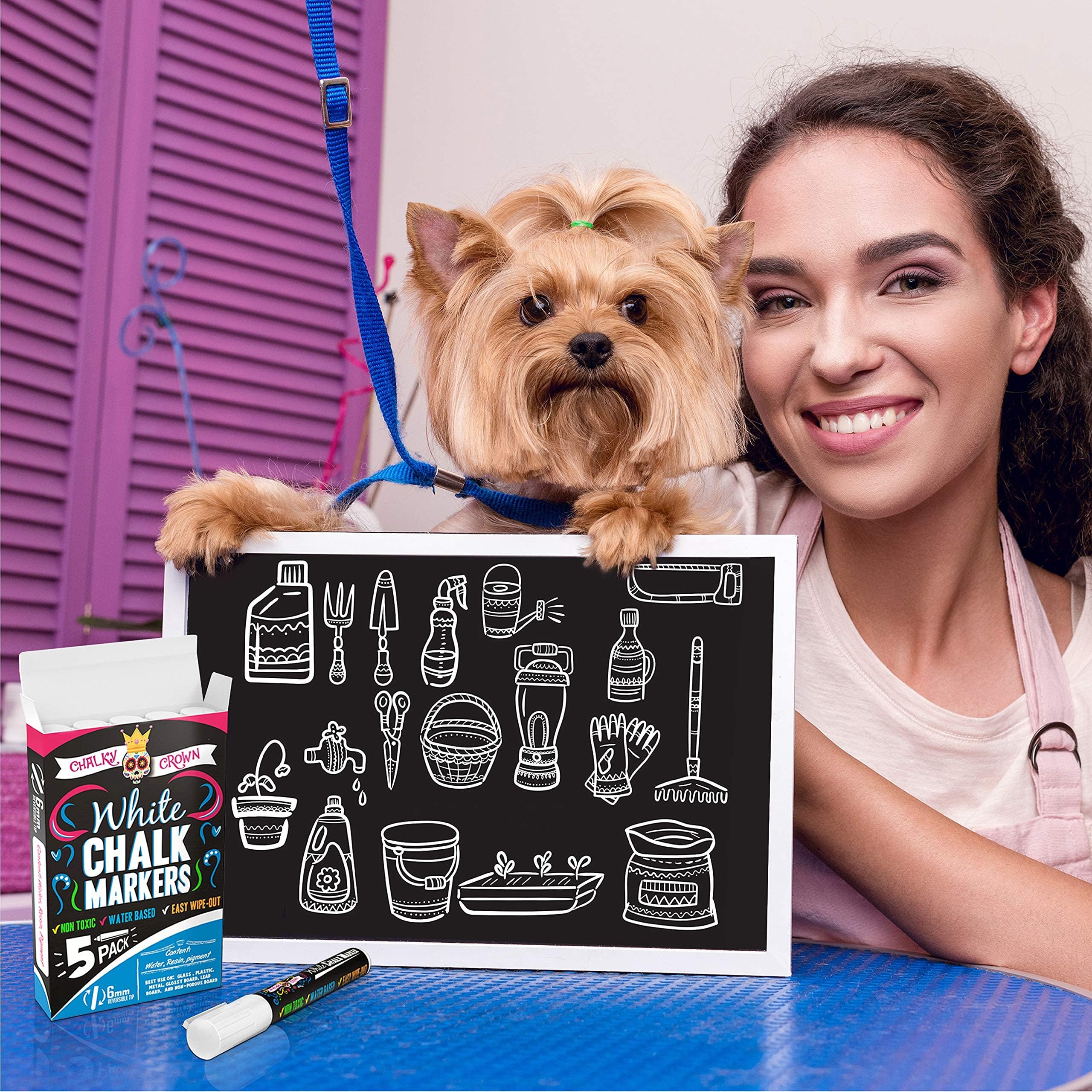 Chalky Crown Flüssige Kreidemarker - Flüssigkreide - Kreidestifte für Tafelschilder, Fenster, Wandtafeln, Glas - 6 mm Umkehrbare Spitze (5er-Pack) - Inklusive 24 Tafeletiketten