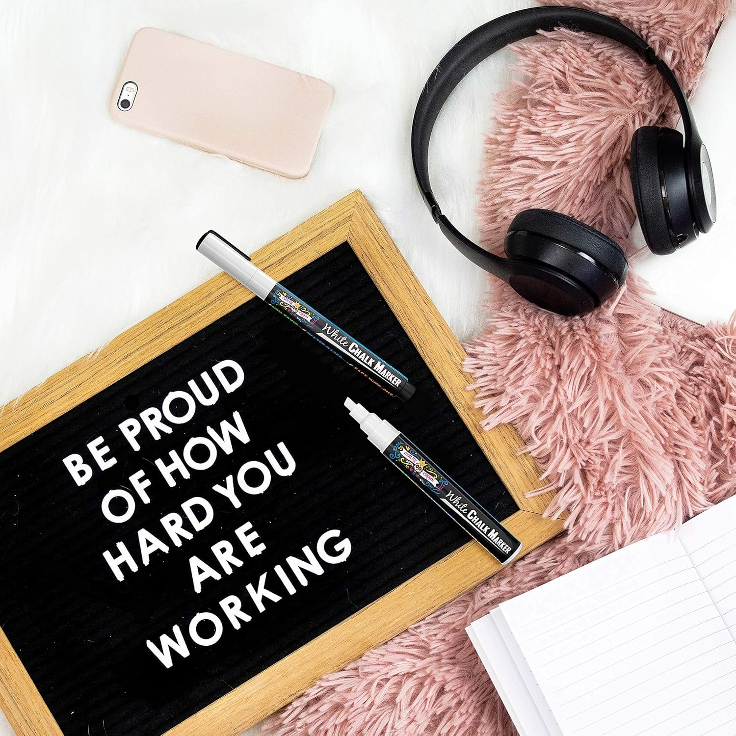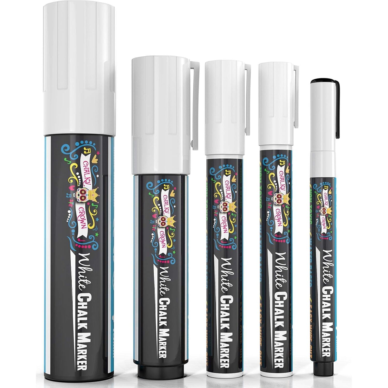 Chalky Crown - Kreidestifte für Tafel Abwaschbar - 5 Weisse Kreidemarker - Ungiftige Flüssigkreide-Marker für Fenster, Glas - 1, 3, 6, 10, 15 mm Spitzen