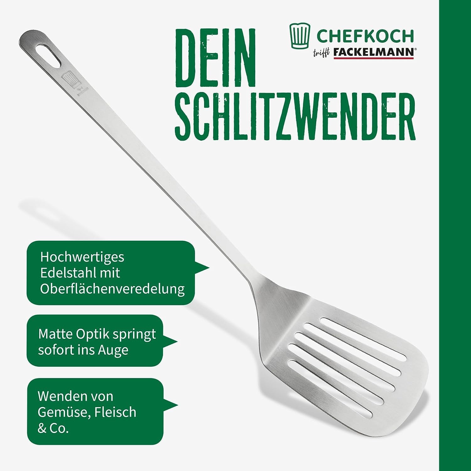 Chefkoch trifft Fackelmann Schlitzwender – Perfekt zum Wenden von Speisen, Edelstahl in mattem Look – Pfannenwender spülmaschinengeeignet