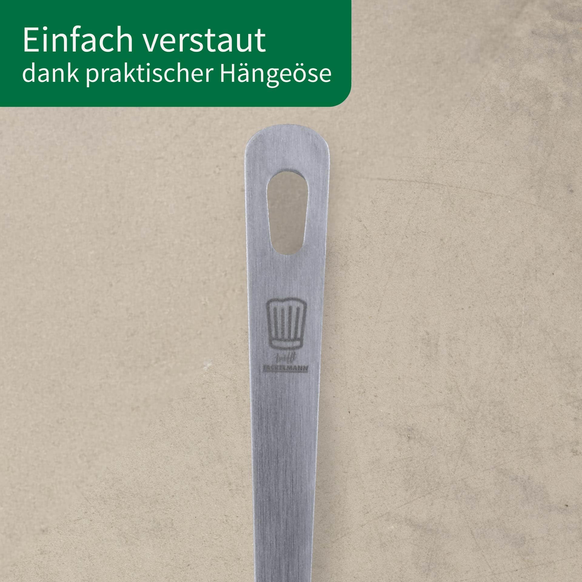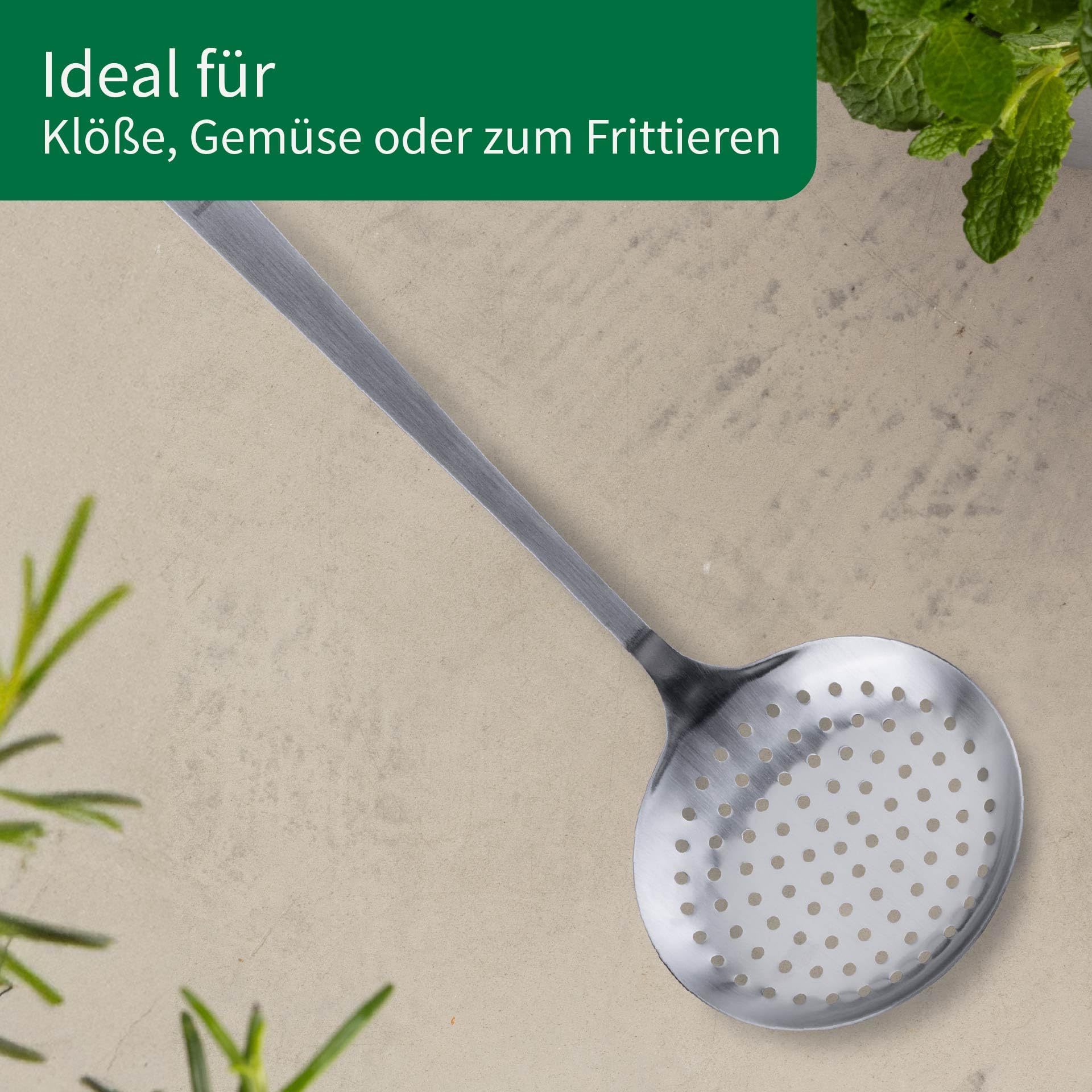 Chefkoch trifft Fackelmann Abseihlöffel - Ideal zum Abseihen von Knödeln, Maultaschen & Co., hochwertiger Edelstahl im matten Look – Kochlöffel spülmaschinengeeignet