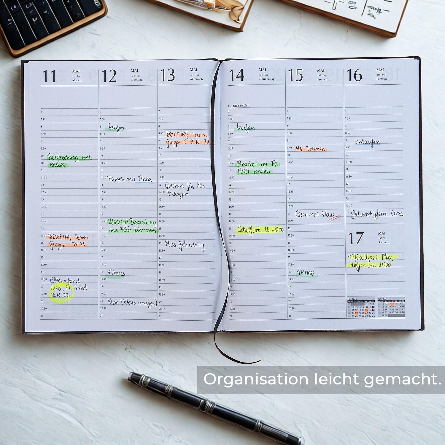 - JAHRESKALENDER 2026/2027: Die Jahreskalender 2026 und 2027 sind im Chefplaner jeweils auf einer Seite zu Beginn des Kalenders enthalten. Zusätzlich bietet dir der Terminkalender 2026 am Ende 17 Seiten für Anmerkungen oder Gesprächsnotizen