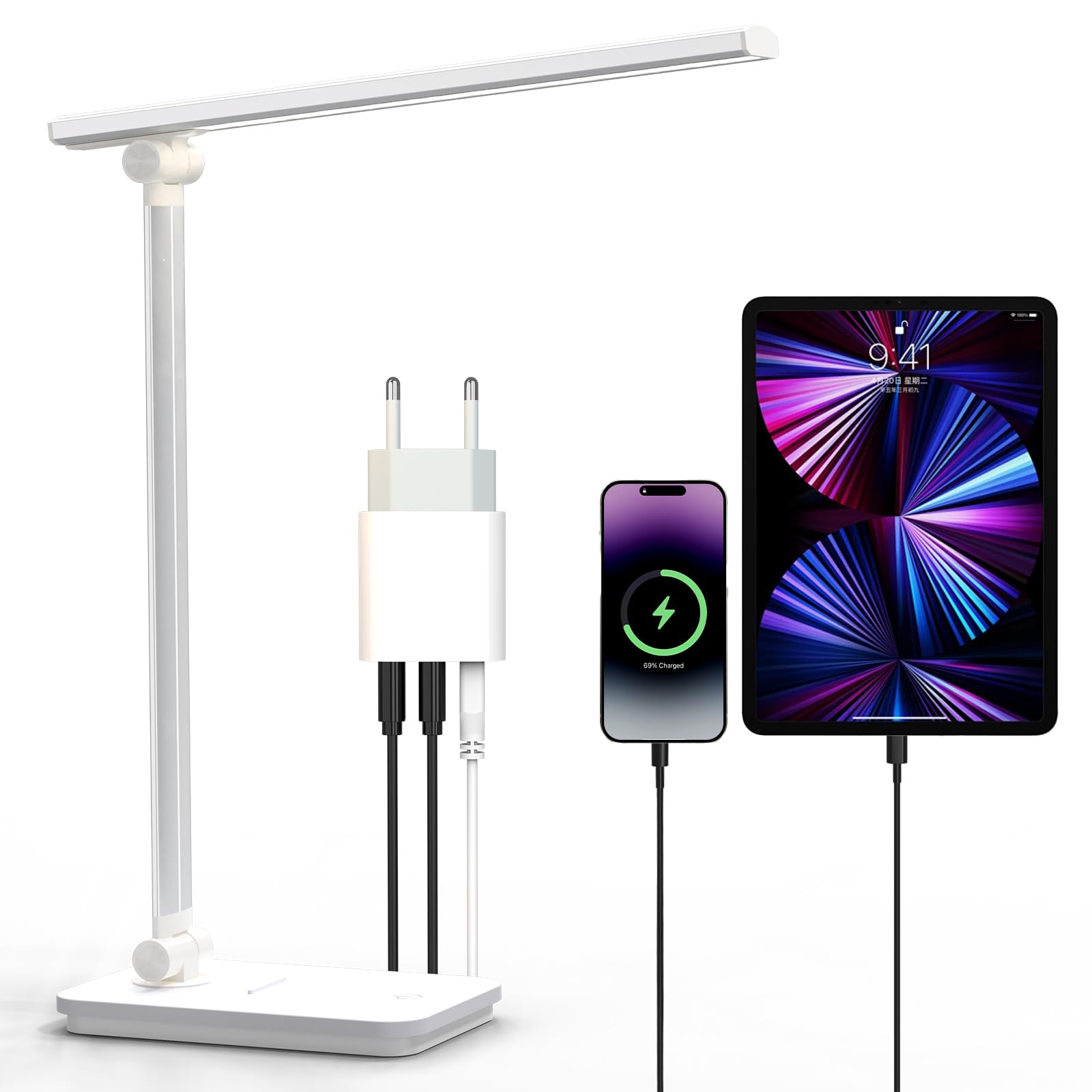 Chesbung Schreibtischlampe, LED Schreibtischlampe, dimmbare Tischleuchte, 5 Farb- und 5 Helligkeitsstufen, Touch-Bedienung, Faltbar, mit USB-Ladeanschluss und Augenschutz (Silber - Mit USB Ladegerät)