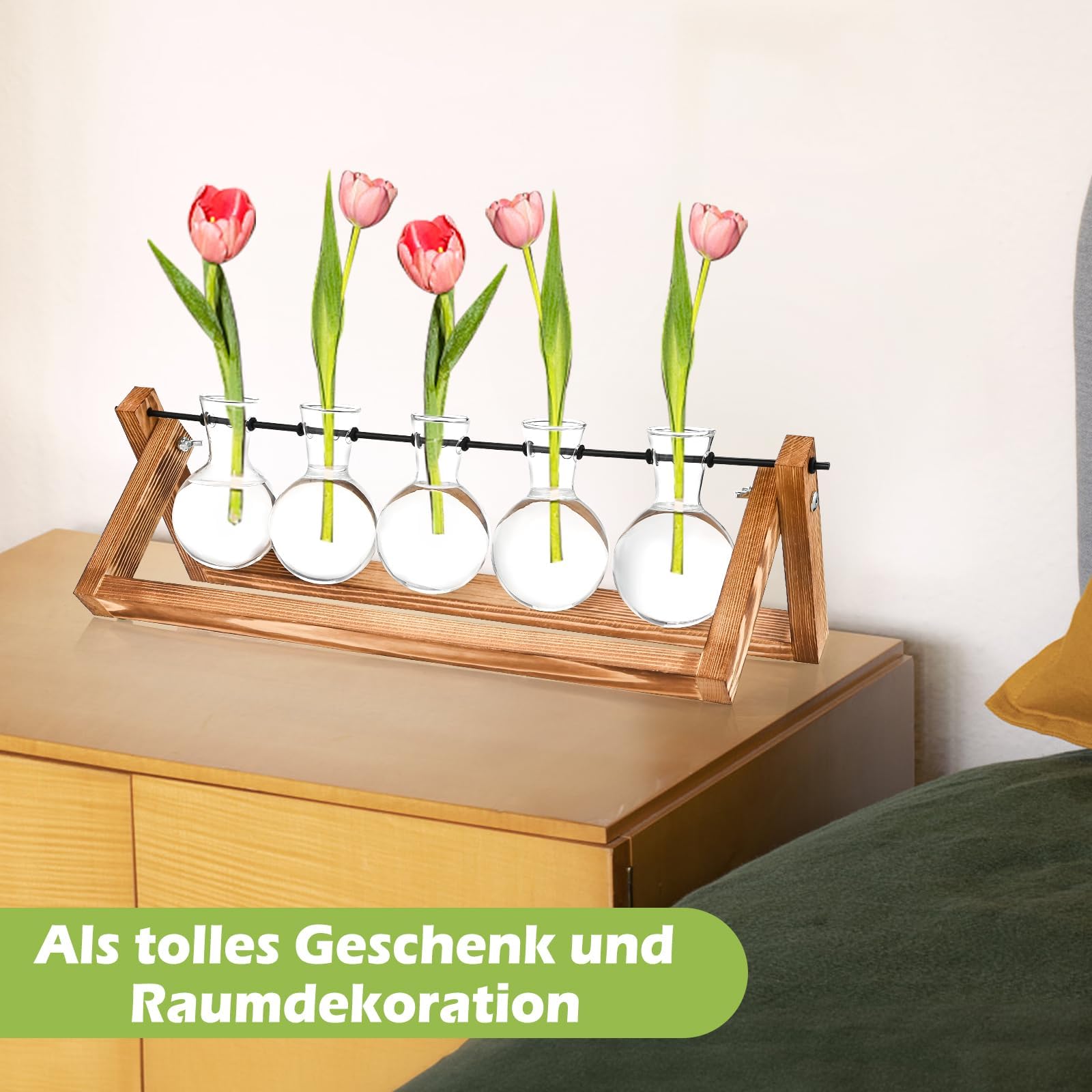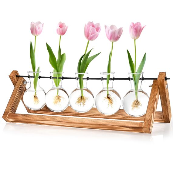Cieex Vintage Kleine Vasen für Tischdeko, Hyindoor Propagation Station, Blumenvase Glasvase mit Holzständer, Kleine Vasen Vintage Glas Reagenzgläser für Hause Büro Wohnzimmer