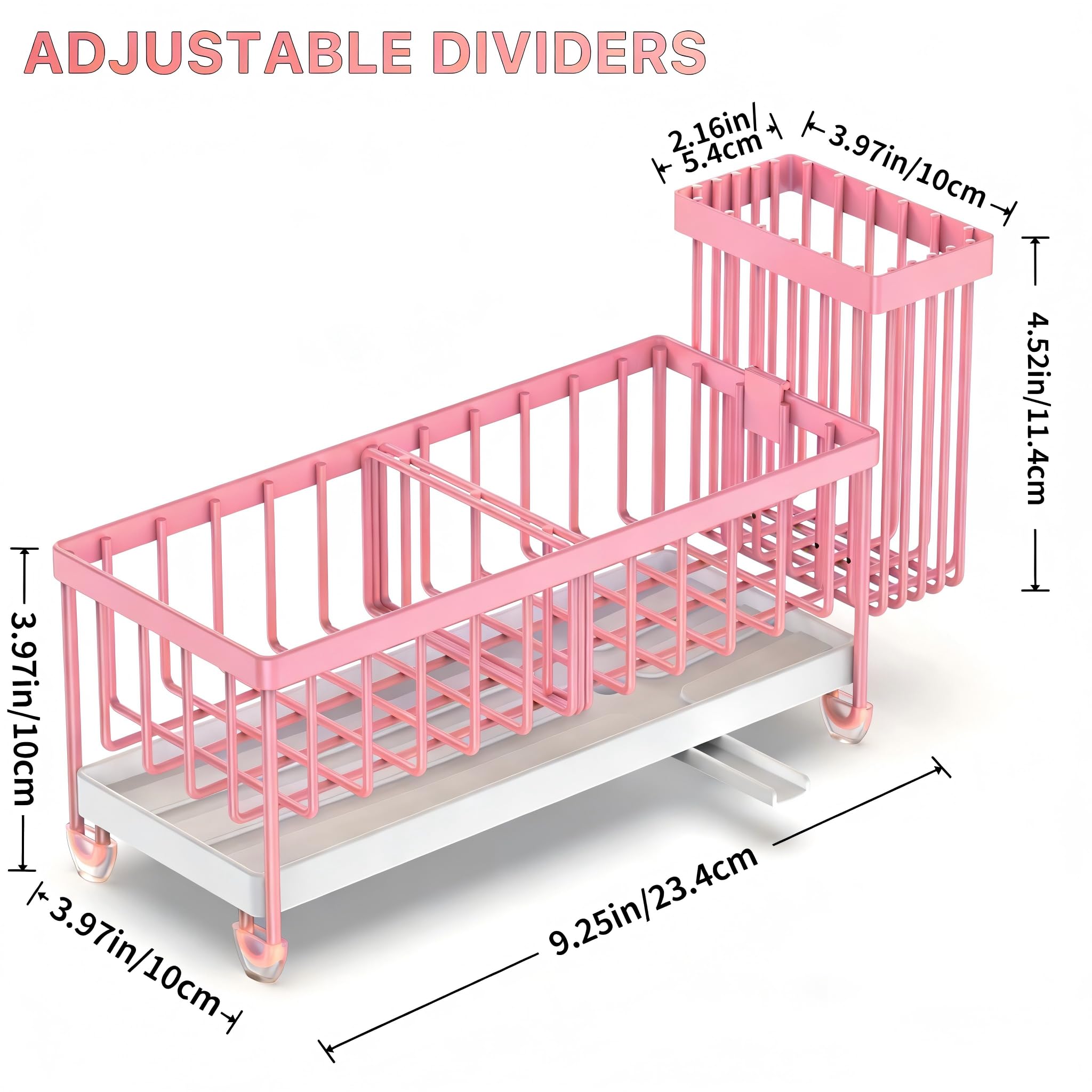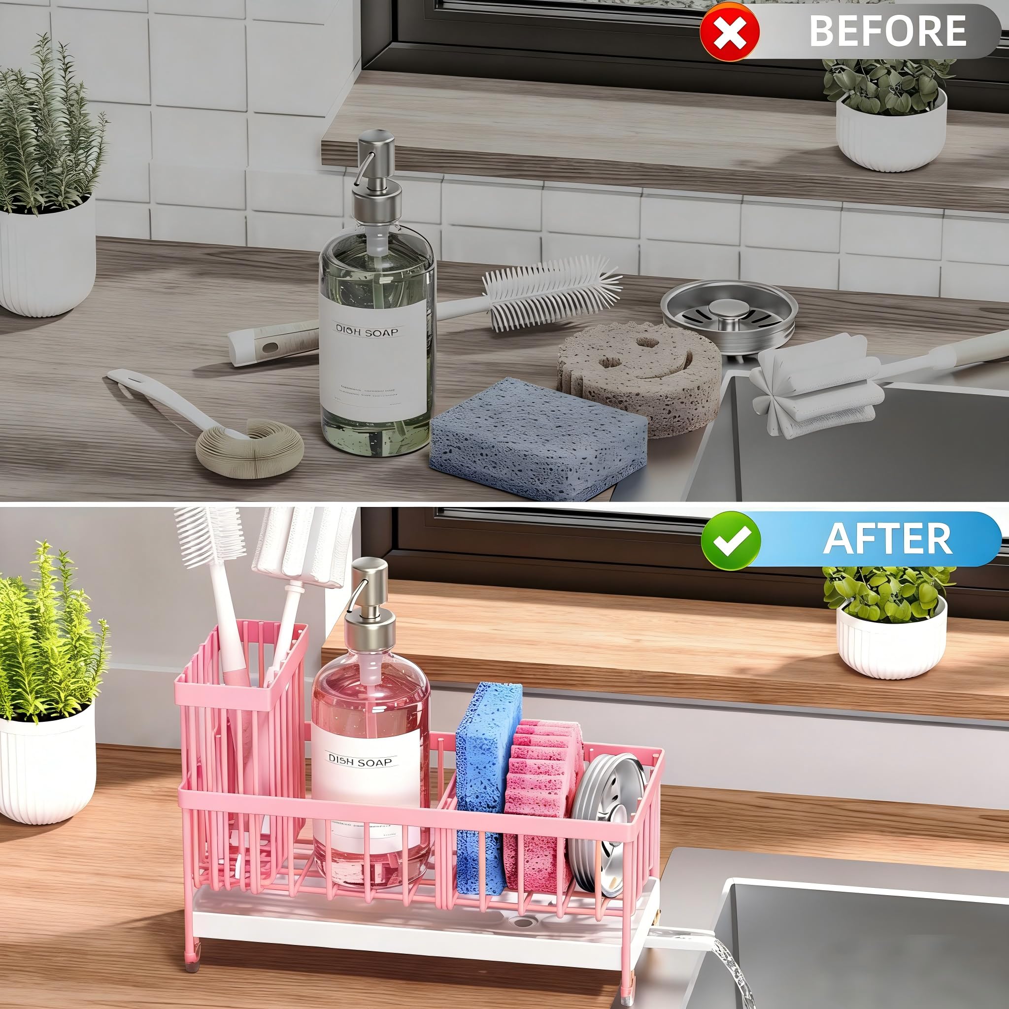 Cisily Pinker Schwammhalter für Küchenspüle, Spülbecken-Caddy Organizer mit hohem Bürstenhalter, Küchenarbeitsplatte, rostfrei, 304 Edelstahl, Seifenspender, Küchenorganizer und