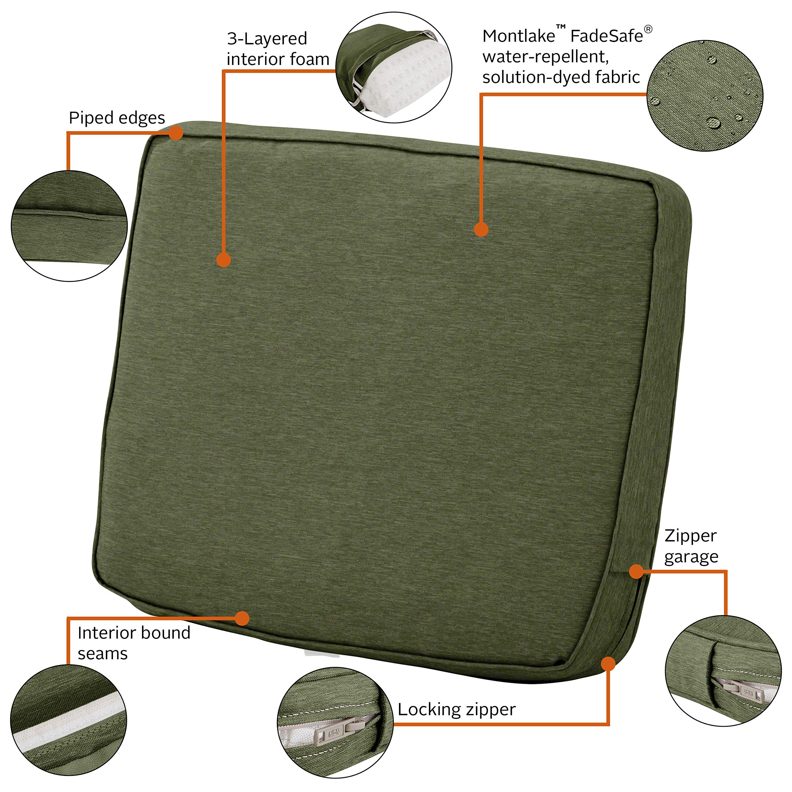 Classic Accessories Die Montlake™-Kissen-Kollektion wird in 6 Farben und 28 Grössen angeboten und ist aus FadeSafe™ lösungsgefärbtem Stoff hergestellt, um sicherzustellen, dass die Farben unter allen Bedingungen halten. Montlake™ FadeSafe™-Gewebe verwendet ein High-Denier-Polyester, um Ihnen maximalen Komfort und dauerhafte Leistung zu bieten. Hochwertige Schaumstoffe verwenden einen dichten Kern mit einer weicheren Aussenschicht, um genau die richtige Menge an Gabe für eine feste, aber komfortable Oberfläche zu bieten. Diese Kissen bieten einen modischen Look mit langlebigen Materialien, um Ihre Terrasse ansprechend und einladend zu machen, wann immer Sie nach draussen gehen möchten. Wenn Sie ein Classic Accessories Terrassenkissen kaufen, erhalten Sie nicht nur ein Kissen, sondern kaufen auch dauerhaften Komfort und Seelenfrieden. Ihre Terrassenkissen werden nicht nur vor den Elementen geschützt, sondern auch mit der einfachsten Garantie in der Branche geschützt. Wenn Ihr Terrassenkissen innerhalb der Garantiezeit ausfällt, suchen Sie online nach uns und nutzen Sie unser problemloses Garantieprogramm, das von unserem in den USA ansässigen Kundenservice-Team unterstützt wird.