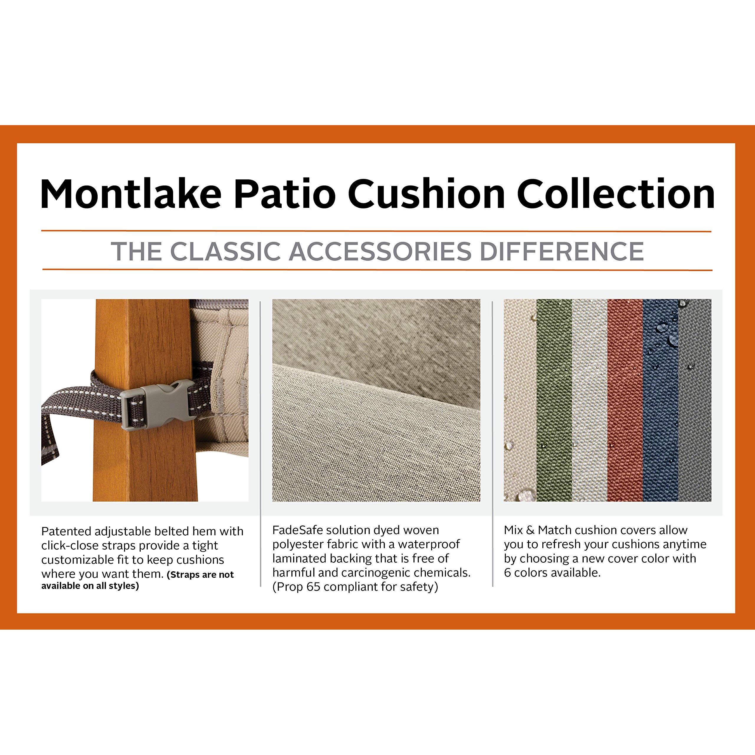 Classic Accessories Die Montlake™-Kissen-Kollektion wird in 6 Farben und 28 Grössen angeboten und ist aus FadeSafe™ lösungsgefärbtem Stoff hergestellt, um sicherzustellen, dass die Farben unter allen Bedingungen halten. Montlake™ FadeSafe™-Gewebe verwendet ein High-Denier-Polyester, um Ihnen maximalen Komfort und dauerhafte Leistung zu bieten. Hochwertige Schaumstoffe verwenden einen dichten Kern mit einer weicheren Aussenschicht, um genau die richtige Menge an Gabe für eine feste, aber komfortable Oberfläche zu bieten. Diese Kissen bieten einen modischen Look mit langlebigen Materialien, um Ihre Terrasse ansprechend und einladend zu machen, wann immer Sie nach draussen gehen möchten. Wenn Sie ein Classic Accessories Terrassenkissen kaufen, erhalten Sie nicht nur ein Kissen, sondern kaufen auch dauerhaften Komfort und Seelenfrieden. Ihre Terrassenkissen werden nicht nur vor den Elementen geschützt, sondern auch mit der einfachsten Garantie in der Branche geschützt. Wenn Ihr Terrassenkissen innerhalb der Garantiezeit ausfällt, suchen Sie online nach uns und nutzen Sie unser problemloses Garantieprogramm, das von unserem in den USA ansässigen Kundenservice-Team unterstützt wird.