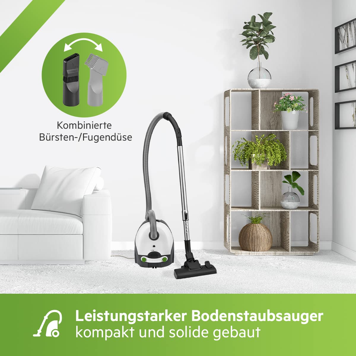 Clatronic® Bodenstaubsauger mit energiesparenden 700 Watt | Staubsauger mit 5-Fach Mikrofiltersystem | Sauger mit Beutel | Umschaltbare Bodenbürste und Bürsten-/Fugendüse | BS 1300 N weiss