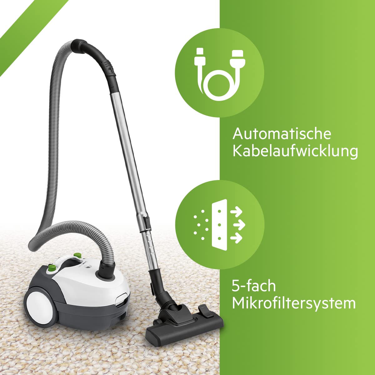 BS 1300 Bodenstaubsauger - 5-fach Mikrofiltersystem - Edelstahl-Teleskoprohr - Umschaltbare Bodenbürste - Staubbeutelwechselanzeige - Praktischer Tragegriff - Automatische Kabelaufwicklung - Platzsparende Parkhilfe - 2-fach Zubehör: kombinierte Bürsten-/Fugendüse - 220-240 V, 50/60 Hz, 700 W