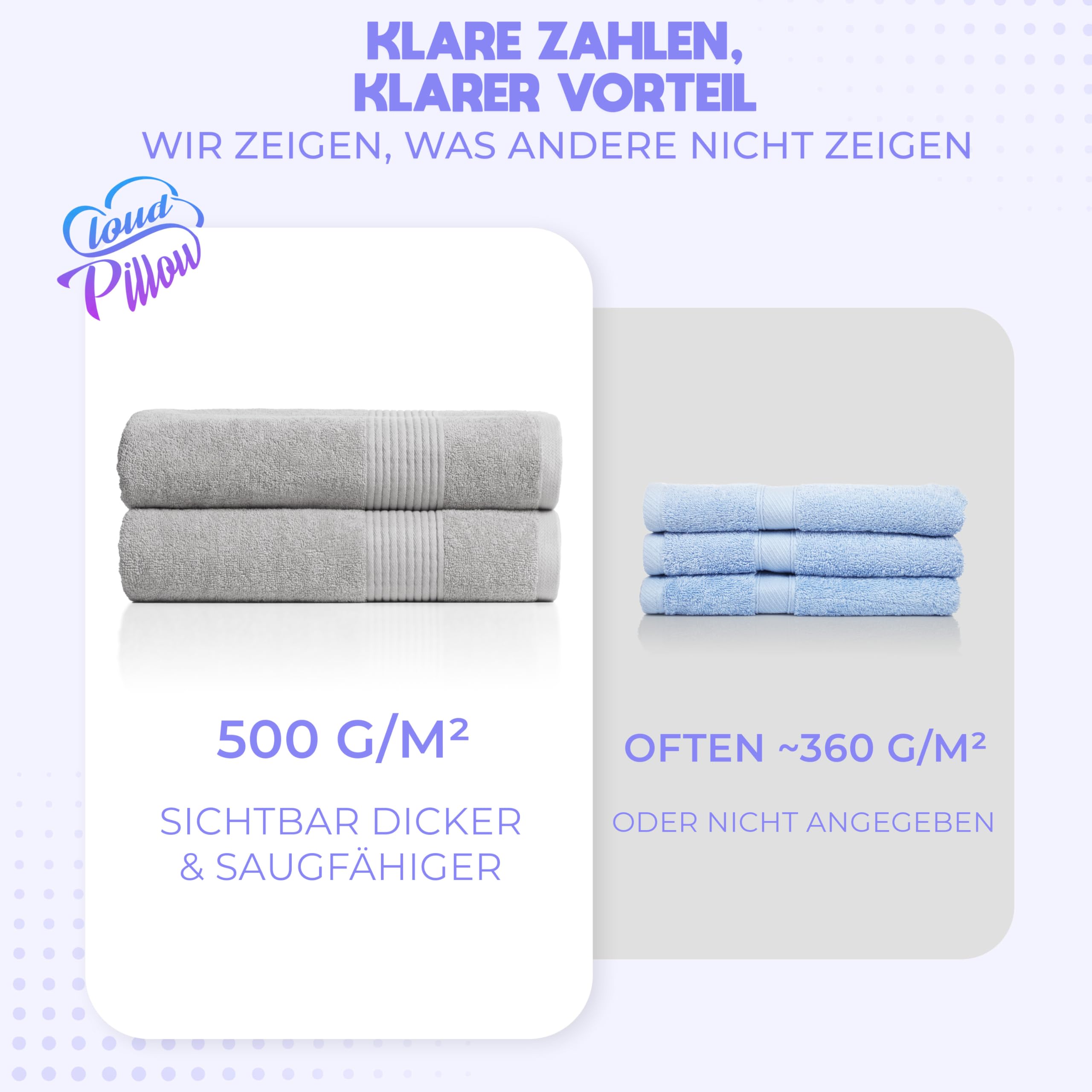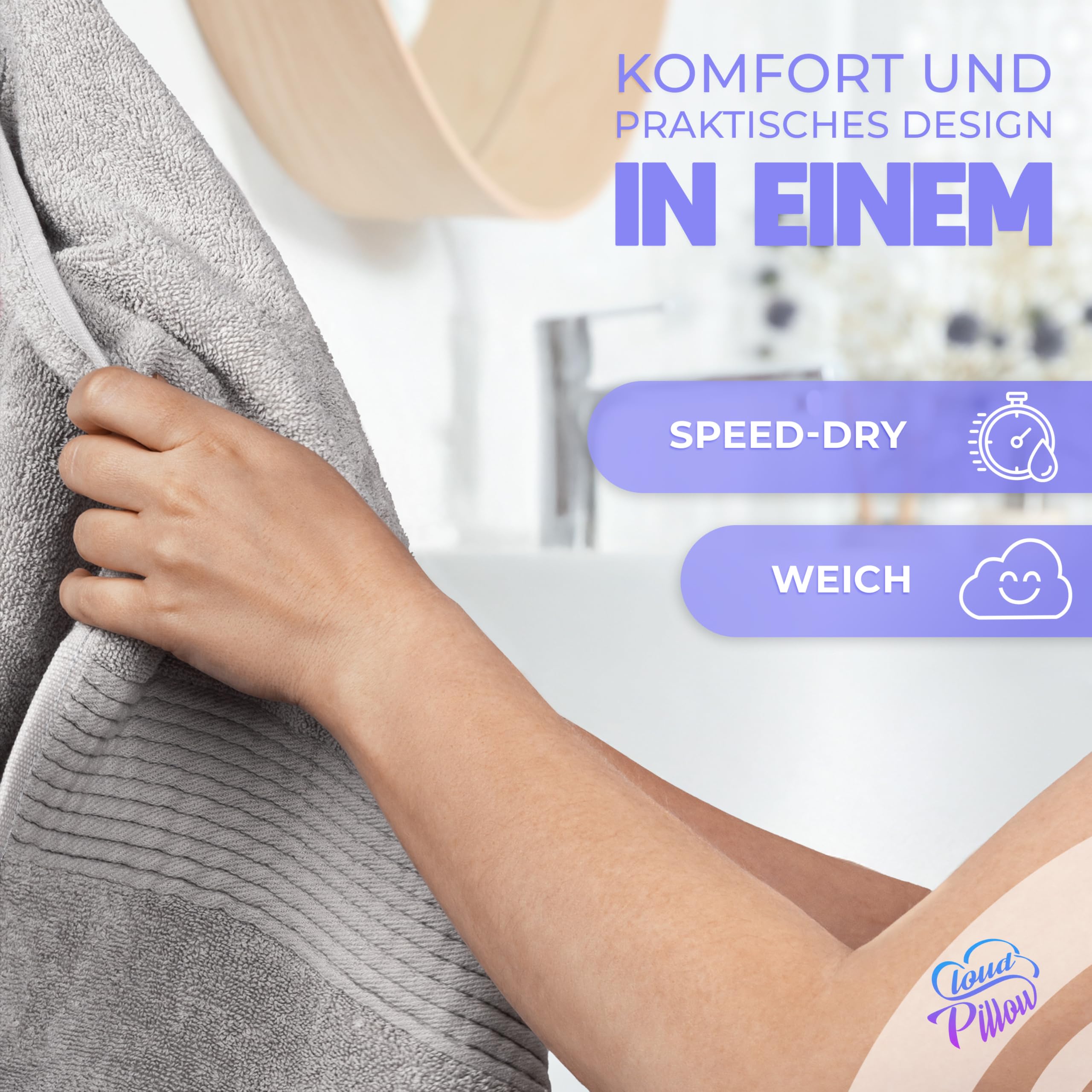 Mindestanzahl für die Bestellung von "Cloud Pillow 2er Set Badetücher 100x150 cm – Badetuch Gross 100% Baumwolle - Duschtücher 500 g/m2 - Weich, Saugstark und Langlebig – Oeko-TEX - Ideal für Bad & Wellness - Hellgrau" ist 1.