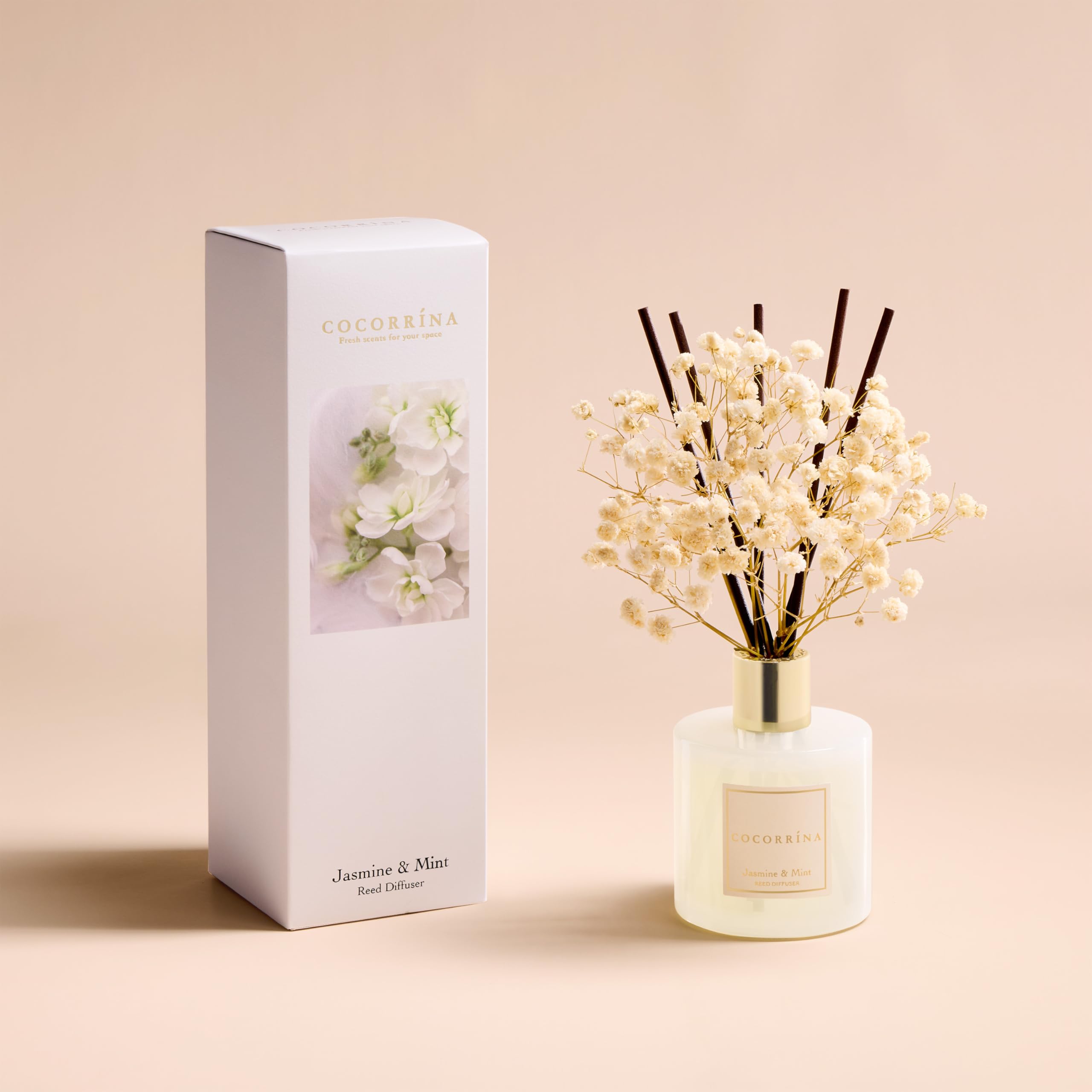 COCORRÍNA Raumduft Reed Diffuser mit 8 Duftstäbchen 200ml, Jasmine & Mint, Natürlich, Langanhaltend, Home Duft ätherisches Öl Reed Diffusor für Badezimmer Regal Dekoration