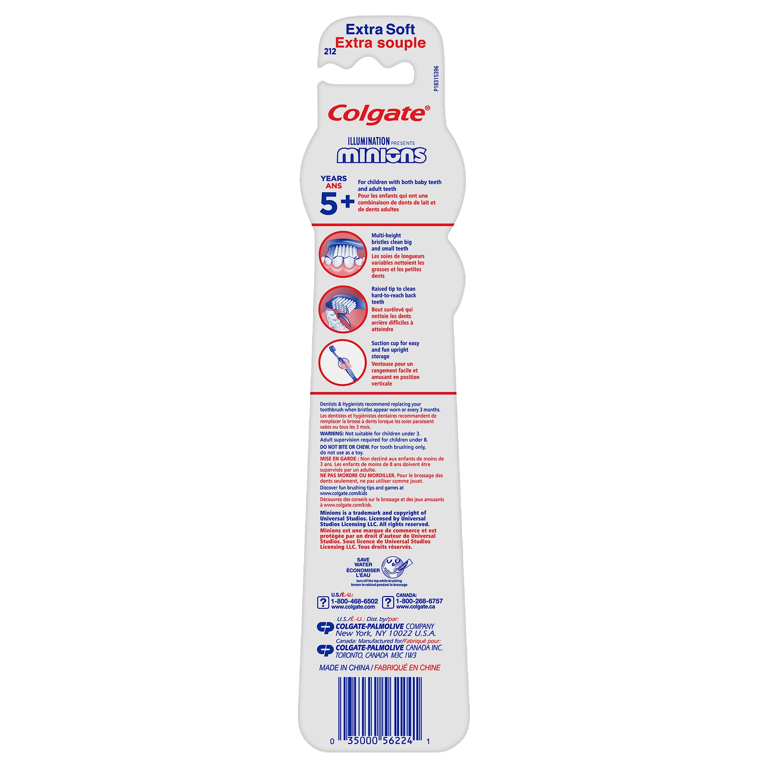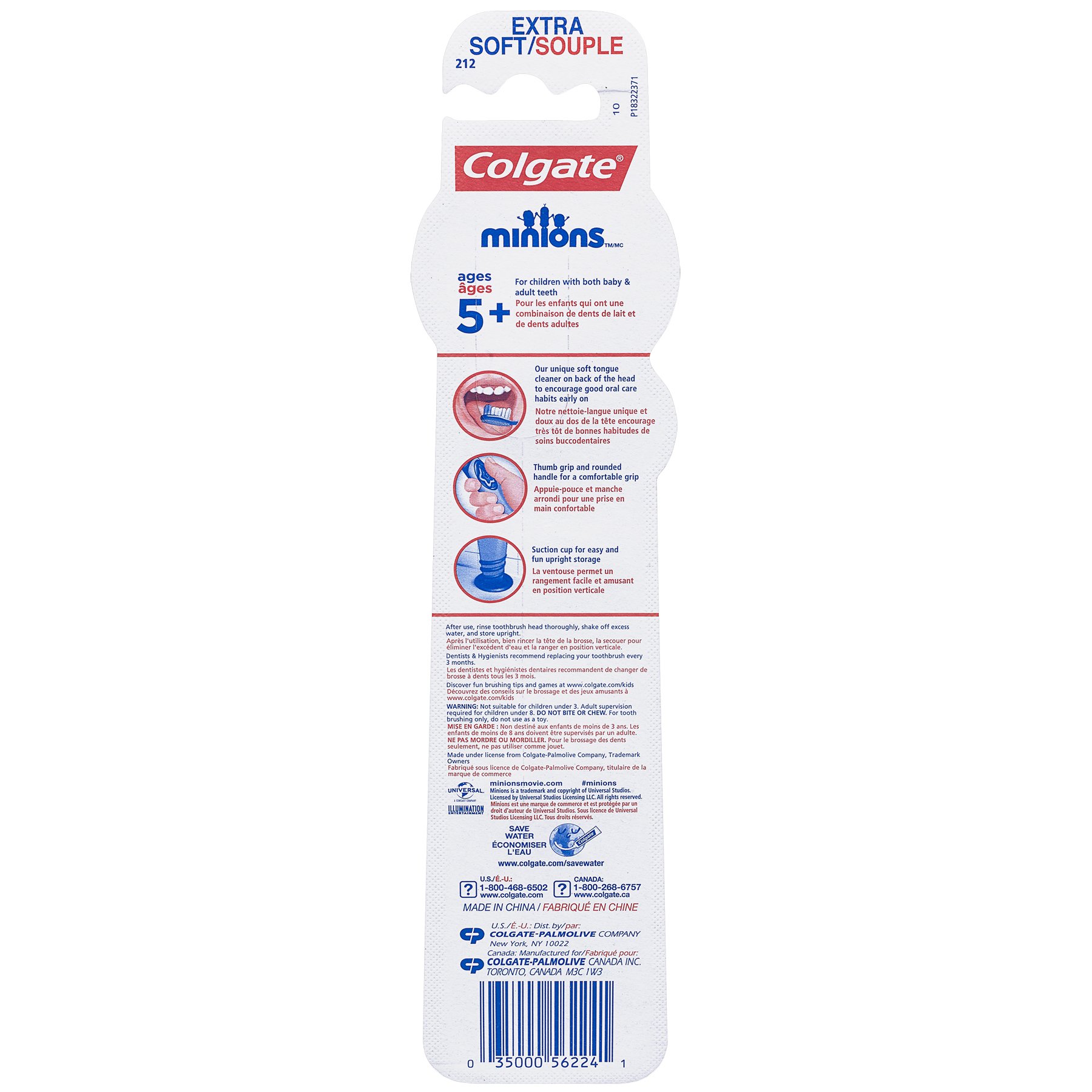 Hinweise: Colgate Minions extra weiche Zahnbürste, für Kinder ab 5 Jahren. Einzigartiger weicher Zungenreiniger auf der Rückseite des Kopfes, um gute Mundpflegegewohnheiten frühzeitig zu fördern. Kleiner ovaler Kopf mit weichem Material schützt den Mund des Kindes. Lustige Minions-Charaktere auf einer speziell entwickelten Bürste für Kinder ab 5 Jahren, die eine Kombination aus Baby- und Erwachsenenzähnen haben. Bequeme Daumenauflage und rutschfester gepolsterter Griff bieten bessere Kontrolle.