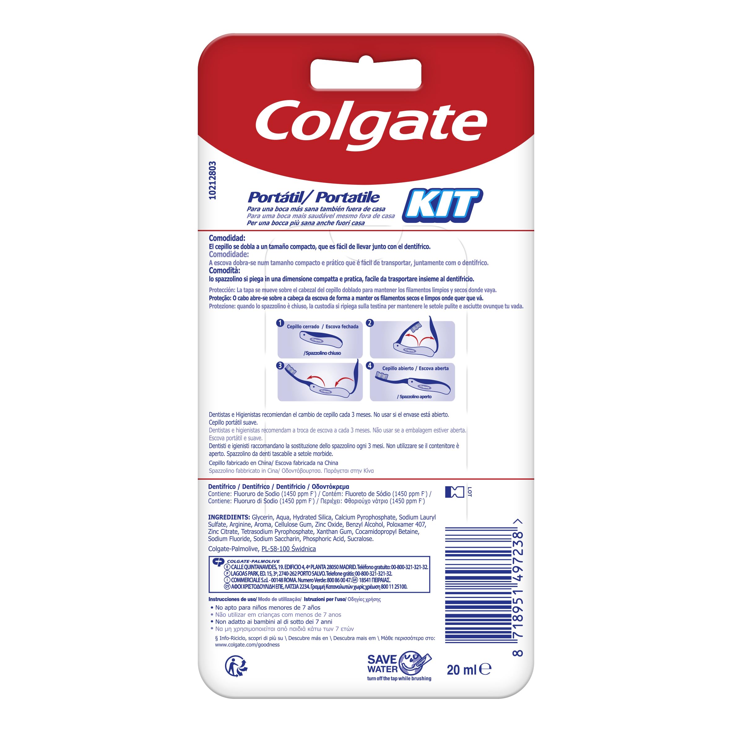 Colgate tragbares Set enthält eine faltbare weiche Reisezahnbürste und eine 20 ml Original-Paste von Colgate Total für einen gesünderen Mund auch unterwegs. Die Bürste biegt sich zusammen mit der Zahnpasta. Die Kappe bewegt sich über den gebogenen Bürstenkopf, um die Borsten sauber und trocken zu halten.