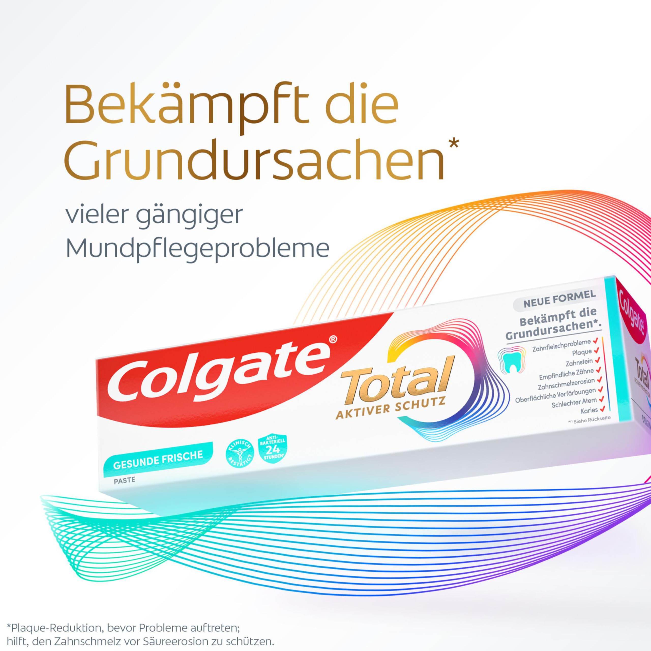 Colgate Total Plus Gesunde Frische Zahnpasta – für einen spürbar gesunden MundraumFür eine umfassende Mundhygiene ist es notwendig, mehr zu tun als nur die Zähne zu putzen. Deshalb bekämpft die Colgate Total Plus Gesunde Frische Zahnpasta proaktiv Bakterien im gesamten Mund, inklusive Zähne, Zunge, Wangeninnenseiten und Zahnfleisch – bis zu 12 Stunden lang*.Für ein sauberes, erfrischtes Mundgefühl und einen angenehmen Atem reduziert die Zahnpasta zudem mundgeruchsverursachende Bakterien, bekämpft Karies, beugt Zahnfleischerkrankungen vor und verhindert den Abbau des Zahnschmelzes.Anwendung: Die Zähne mindestens zweimal täglich putzen oder den Empfehlungen des Zahnarztes folgen. Tube nach Gebrauch verschliessen, um die Produktqualität zu erhalten. Für Kinder unter 7 Jahren nicht geeignet.Die Produktvorteile im Detail:Colgate Total Plus Gesunde Frische ZahnpastaBakterien werden proaktiv für bis zu 12 Stunden* bekämpftHält den gesamten Mundraum** gesundReduziert mundgeruchsverursachende Bakterien für frischen AtemBekämpft Karies wirksamZur täglichen Anwendung geeignetInhalt: 2x75 ml Tube*Nach 4 Wochen regelmässiger Anwendung **Schutz für den ganzen Mund, d. h. Zähne, Zunge, Wangeninnenseiten und Zahnfleisch