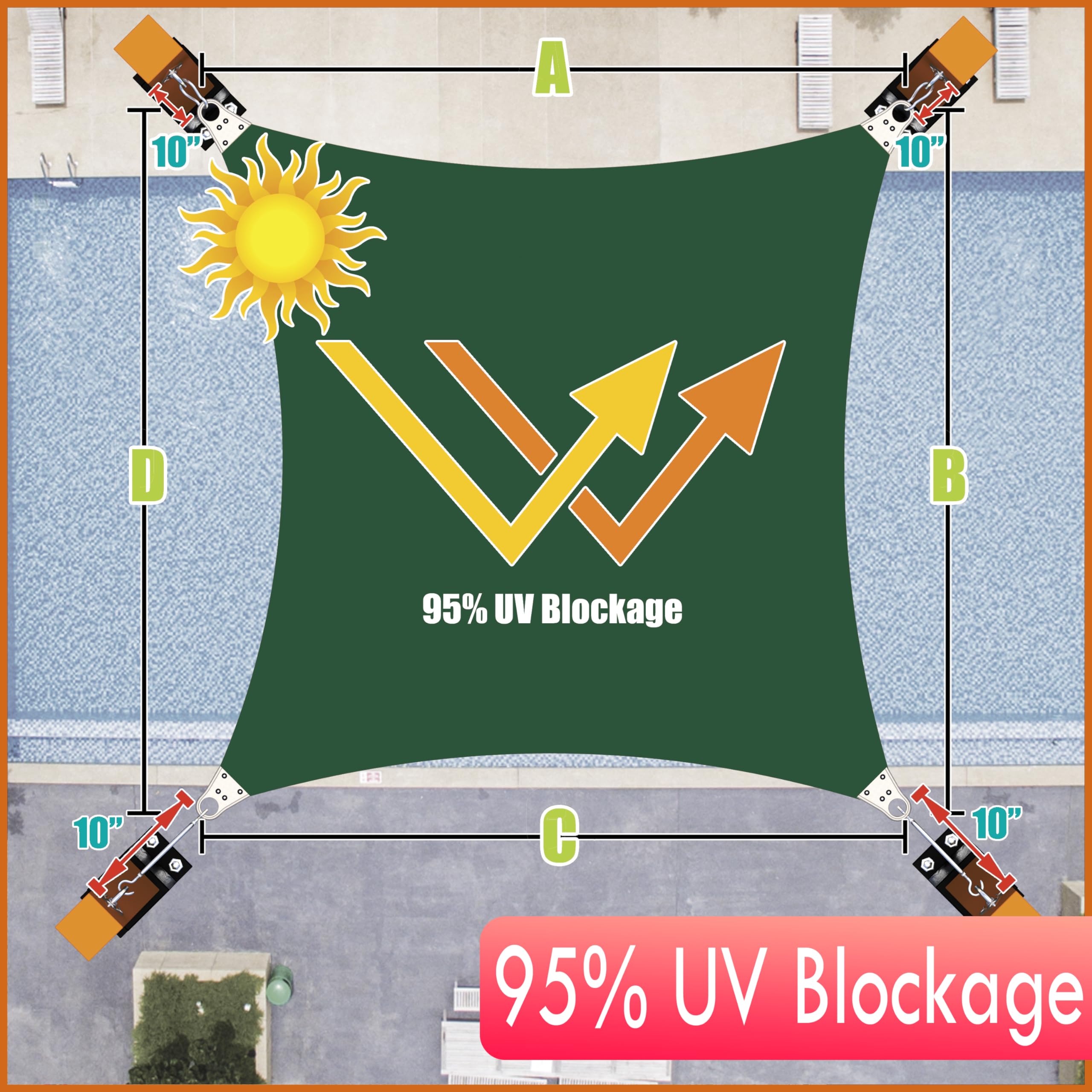 - ★【95% UV-Blockierung & atmungsaktives gewebtes Stoff】: Blockiert 95% der schädlichen UV-Strahlen, reduziert deutlich die Temperatur und UV-Sonnenlicht im Schatten während der Sommerzeit, ideal für Terrasse, Schwimmbad, Balkon, Carport usw. Atmungsaktives Gewebe lässt Wasser und Luft frei durch, kein Poolwasser an regnerischen Tagen, beständig gegen UV und Wasser, keine Wartung erforderlich.