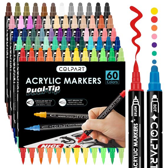 colpart Acrylic Paint Markers,Acrylic Paint Pens Paint Markers,60 Colors Dual Tip Paint Pens With Medium Tip and Brush