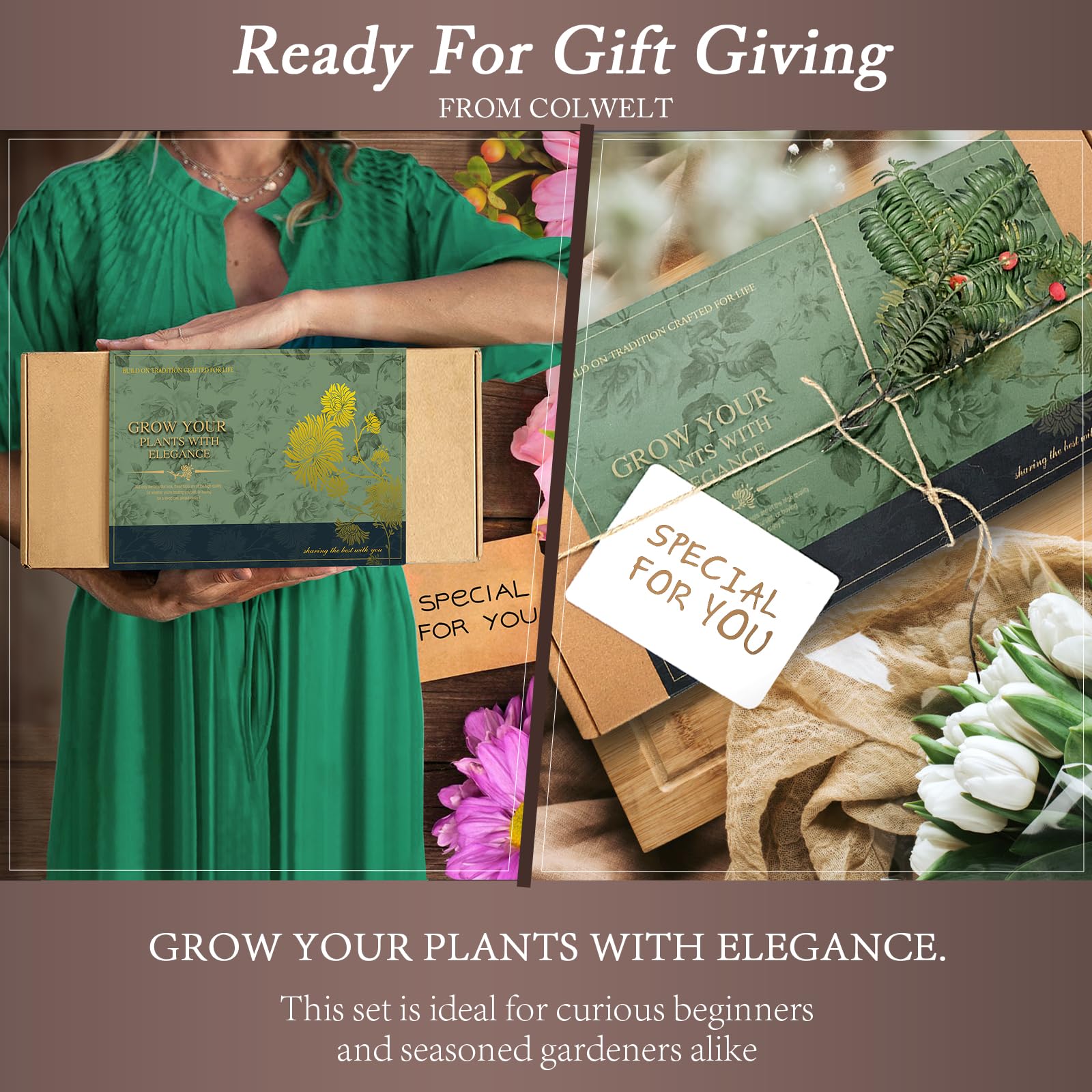 Colwelt Gartengeräte-Set, 8-teilig, Gartengeräte mit Holzgriff, einschliesslich Gartentasche, Kniepolster, Handschuhe, Gartenschere, Kelle, Tulpenkelle, Grubber – Gartengeschenke für Damen und Herren