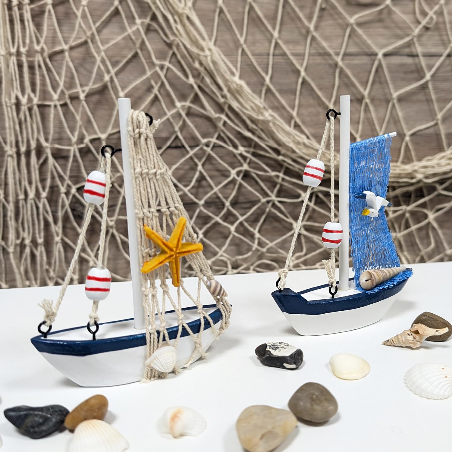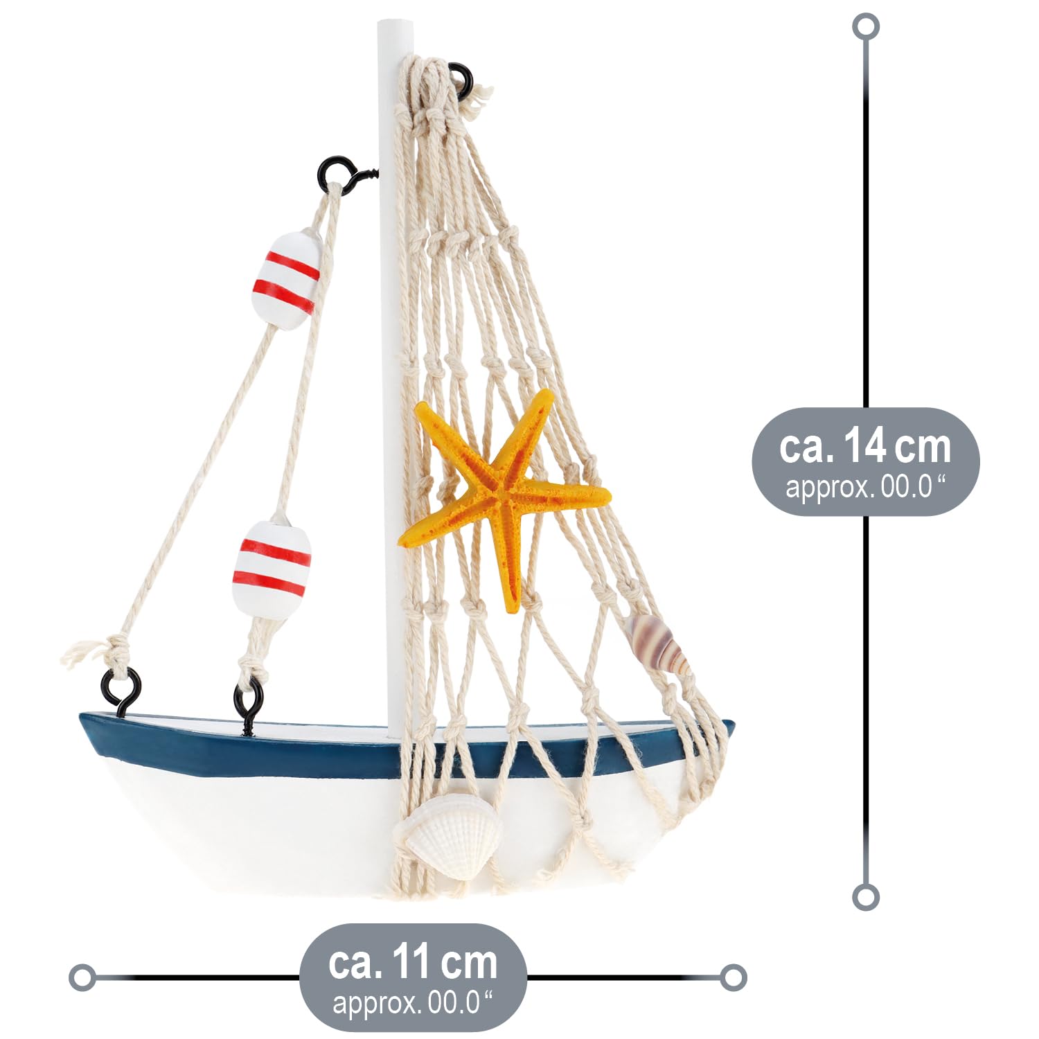 com-four® Maritimes Deko Schiff aus Holz - Fischkutter mit Fischernetz und Muscheln - Holzschiff zur Dekoration - Nautische Deko Segelboot (2 Stück Segelboot - blau/weiss/rot)