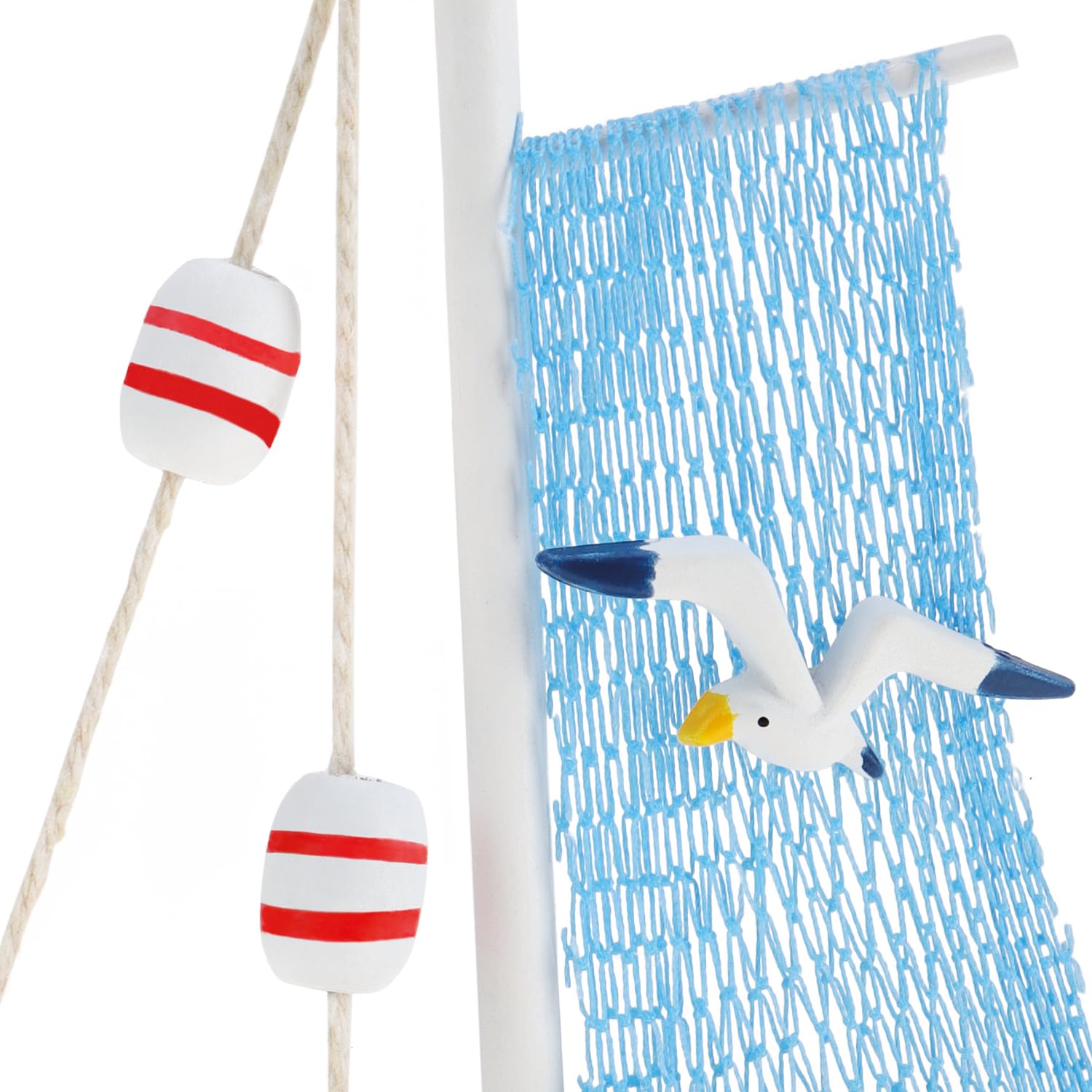 Das maritime Deko-Schiff aus Holz ist absolut authentisch gestaltet mit seinem geklebten Fischernetz und den beiden Fahnenmasten.