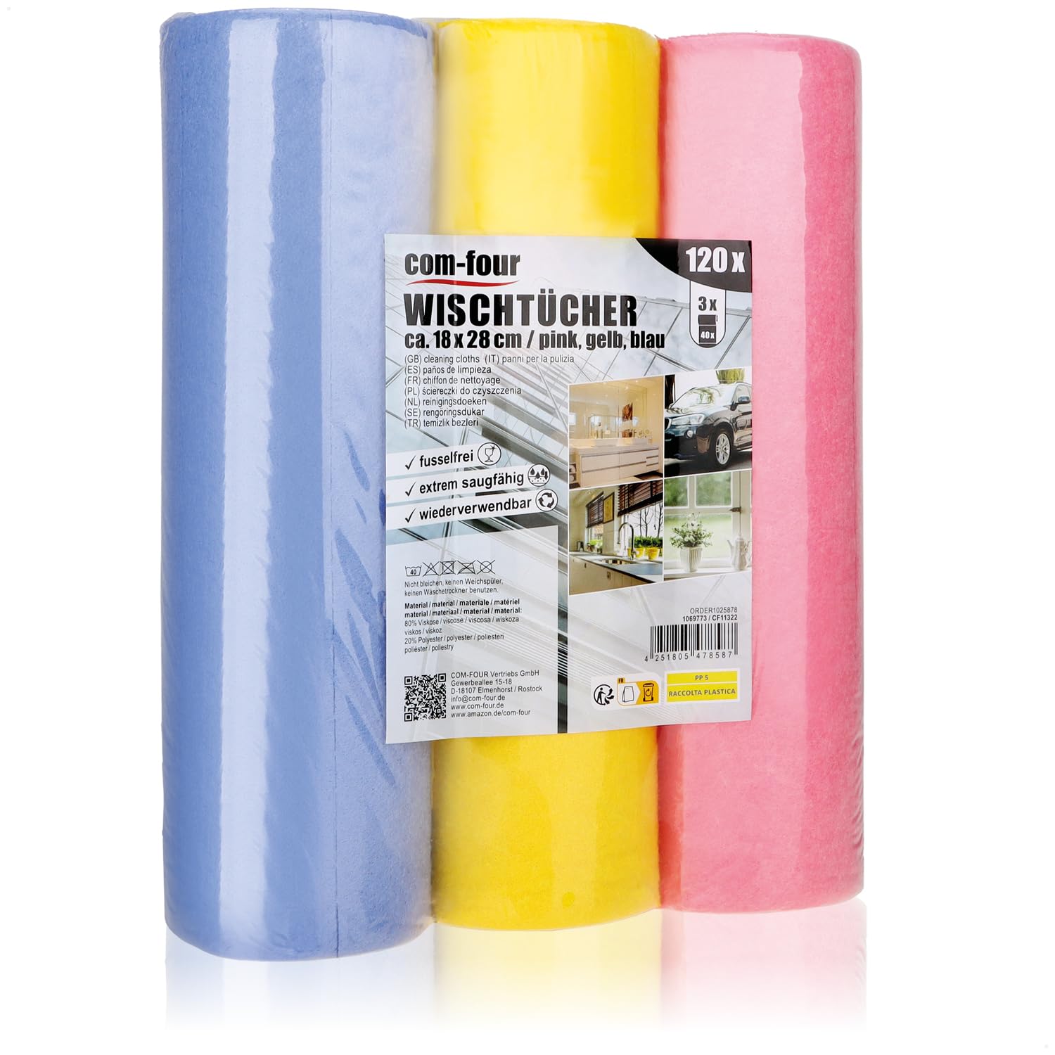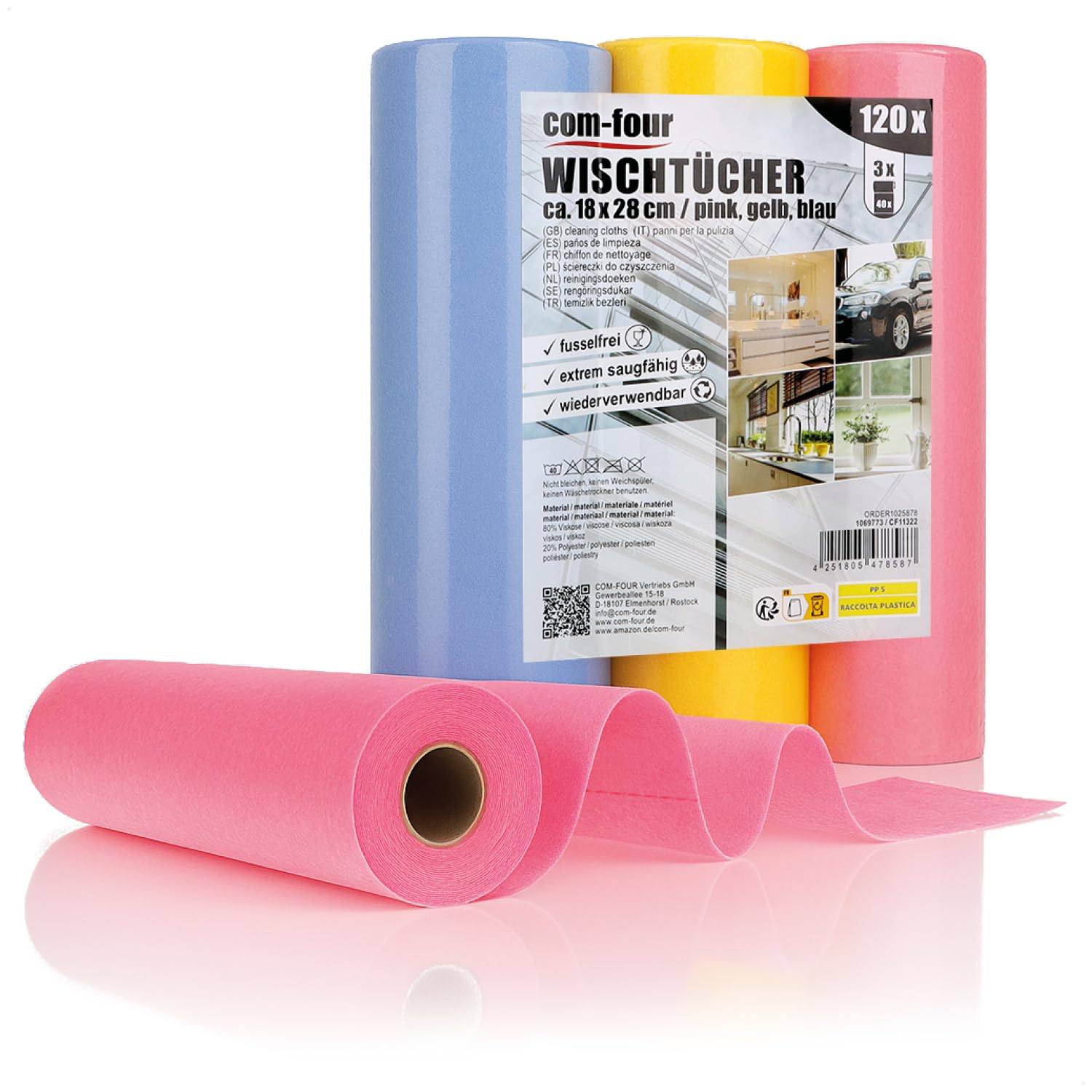 com-four® 120x Haushaltstücher auf Rollen in 3 Farben - extrem saugfähige und strapazierbare Reinigungstücher aus Viskose - Wiederverwendbare Allzweck-Wischtücher (18x28-120 Stück - Rolle)