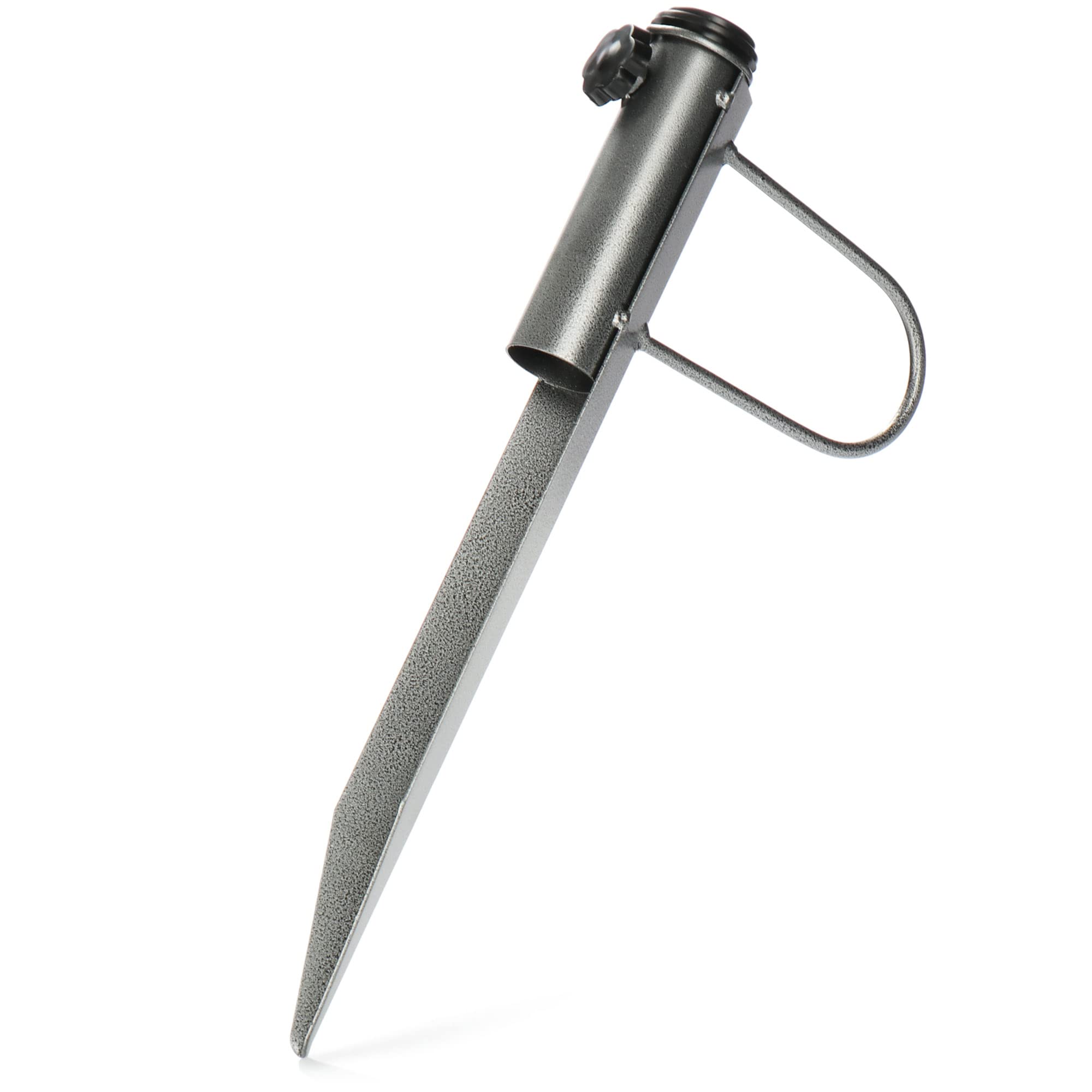 Der robuste Sonnenschirmhalter besteht aus massivem Metall und kann mit einem Gummihammer leicht in normale Böden geschlagen werden.