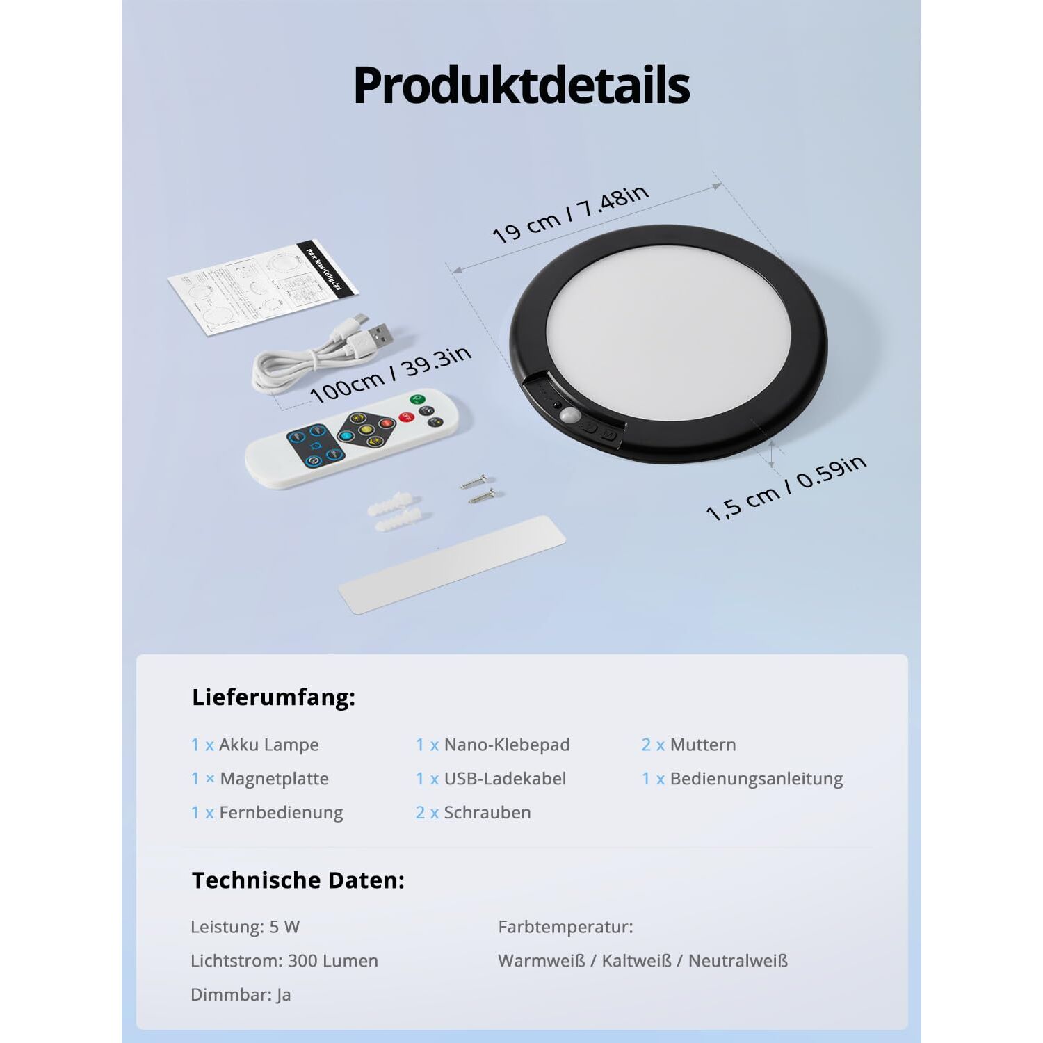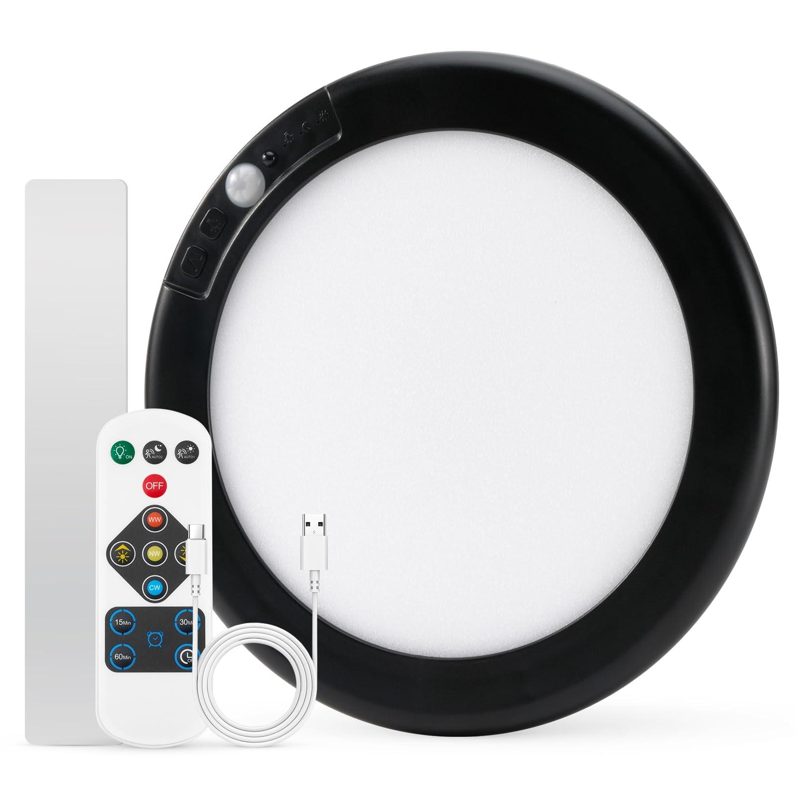 Combuh Wiederaufladbare Deckenleuchte mit Bewegungssensor und Fernbedienung Unsere Deckenlampe mit Bewegungssensor verwenden hochwertige Lampenschirme und LED-Lichtquellen, um gleichmässiges und weiches Licht zu liefern, kein Flackern, keine Blendung und schützen Ihre Augen effektiv. Diese Innenleuchten mit Bewegungsmelder ohne Verkabelung eignen sich perfekt für dunkle Bereiche ohne Strom, wie Schrank, Dusche, Treppen, Speisekammer, Flur, Veranda, Garage usw. Besondere Merkmale: Vielseitige Funktionalität: Mit drei Arbeitsmodi, einstellbarer Farbtemperatur und stufenloser Dimmung erfüllen Deckenleuchten für das Wohnzimmer alle Ihre Beleuchtungsbedürfnisse. Ferngesteuerte Präzision: Übernehmen Sie mit der mitgelieferten Fernbedienung die volle Kontrolle über Ihr Beleuchtungserlebnis. Passen Sie Helligkeit und Farbtemperatur an, ändern Sie den Arbeitsmodus und stellen Sie Timer-Einstellungen mühelos von überall im Raum aus ein. Problemloses Aufladen: Verabschieden Sie sich von häufigen Batteriewechseln. Unsere Deckenleuchten für Schlafzimmer verfügen über einen wiederaufladbaren Akku, der einfach über ein Typ-C-Kabel mit Strom versorgt werden kann. Geniessen Sie eine kontinuierliche Beleuchtung ohne lästiges Batteriewechseln. Bohrfreie, magnetische Installation: Dank des magnetischen Installationsdesigns ist die Einrichtung ein Kinderspiel. Kein Bohren oder Schrauben nötig – befestigen Sie es einfach an der Stelle, an der es installiert werden soll, für eine schnelle und werkzeuglose Installation in wenigen Minuten. Ultradünnes Design: Trotz ihres schlanken Profils liefert diese Deckenleuchte eine starke Beleuchtung und fügt sich nahtlos in jeden Raum ein. Werten Sie Ihr Interieur mit seinem schlanken Design und der unübertroffenen Funktionalität auf. Erleben Sie die ultimative Mischung aus Komfort, Vielseitigkeit und Stil mit unserer wiederaufladbaren Deckenleuchte.