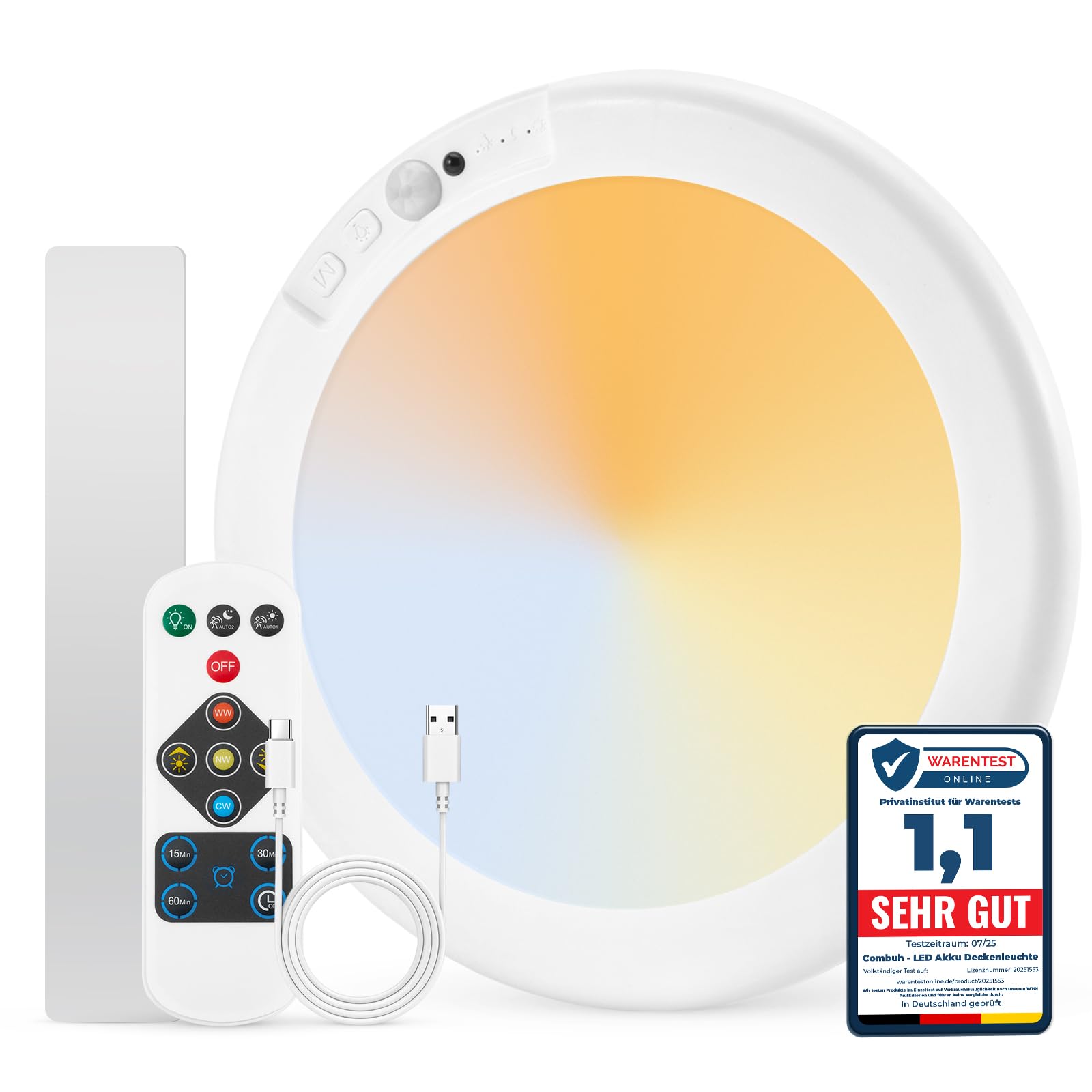 Combuh Wiederaufladbare Deckenleuchte mit Bewegungssensor und FernbedienungUnsere Deckenlampe mit Bewegungssensor verwenden hochwertige Lampenschirme und LED-Lichtquellen, um gleichmässiges und weiches Licht zu liefern, kein Flackern, keine Blendung und schützen Ihre Augen effektiv. Diese Innenleuchten mit Bewegungsmelder ohne Verkabelung eignen sich perfekt für dunkle Bereiche ohne Strom, wie Schrank, Dusche, Treppen, Speisekammer, Flur, Veranda, Garage usw.Besondere Merkmale:Vielseitige Funktionalität: Mit drei Arbeitsmodi, einstellbarer Farbtemperatur und stufenloser Dimmung erfüllen Deckenleuchten für das Wohnzimmer alle Ihre Beleuchtungsbedürfnisse.Ferngesteuerte Präzision: Übernehmen Sie mit der mitgelieferten Fernbedienung die volle Kontrolle über Ihr Beleuchtungserlebnis. Passen Sie Helligkeit und Farbtemperatur an, ändern Sie den Arbeitsmodus und stellen Sie Timer-Einstellungen mühelos von überall im Raum aus ein.Problemloses Aufladen: Verabschieden Sie sich von häufigen Batteriewechseln. Unsere Deckenleuchten für Schlafzimmer verfügen über einen wiederaufladbaren Akku, der einfach über ein Typ-C-Kabel mit Strom versorgt werden kann. Geniessen Sie eine kontinuierliche Beleuchtung ohne lästiges Batteriewechseln.Bohrfreie, magnetische Installation: Dank des magnetischen Installationsdesigns ist die Einrichtung ein Kinderspiel. Kein Bohren oder Schrauben nötig – befestigen Sie es einfach an der Stelle, an der es installiert werden soll, für eine schnelle und werkzeuglose Installation in wenigen Minuten.Ultradünnes Design: Trotz ihres schlanken Profils liefert diese Deckenleuchte eine starke Beleuchtung und fügt sich nahtlos in jeden Raum ein. Werten Sie Ihr Interieur mit seinem schlanken Design und der unübertroffenen Funktionalität auf.Erleben Sie die ultimative Mischung aus Komfort, Vielseitigkeit und Stil mit unserer wiederaufladbaren Deckenleuchte.