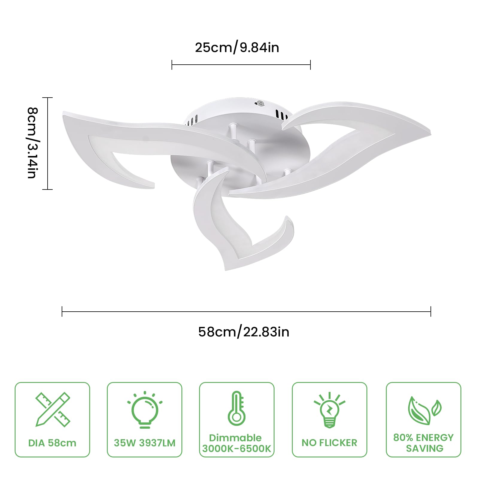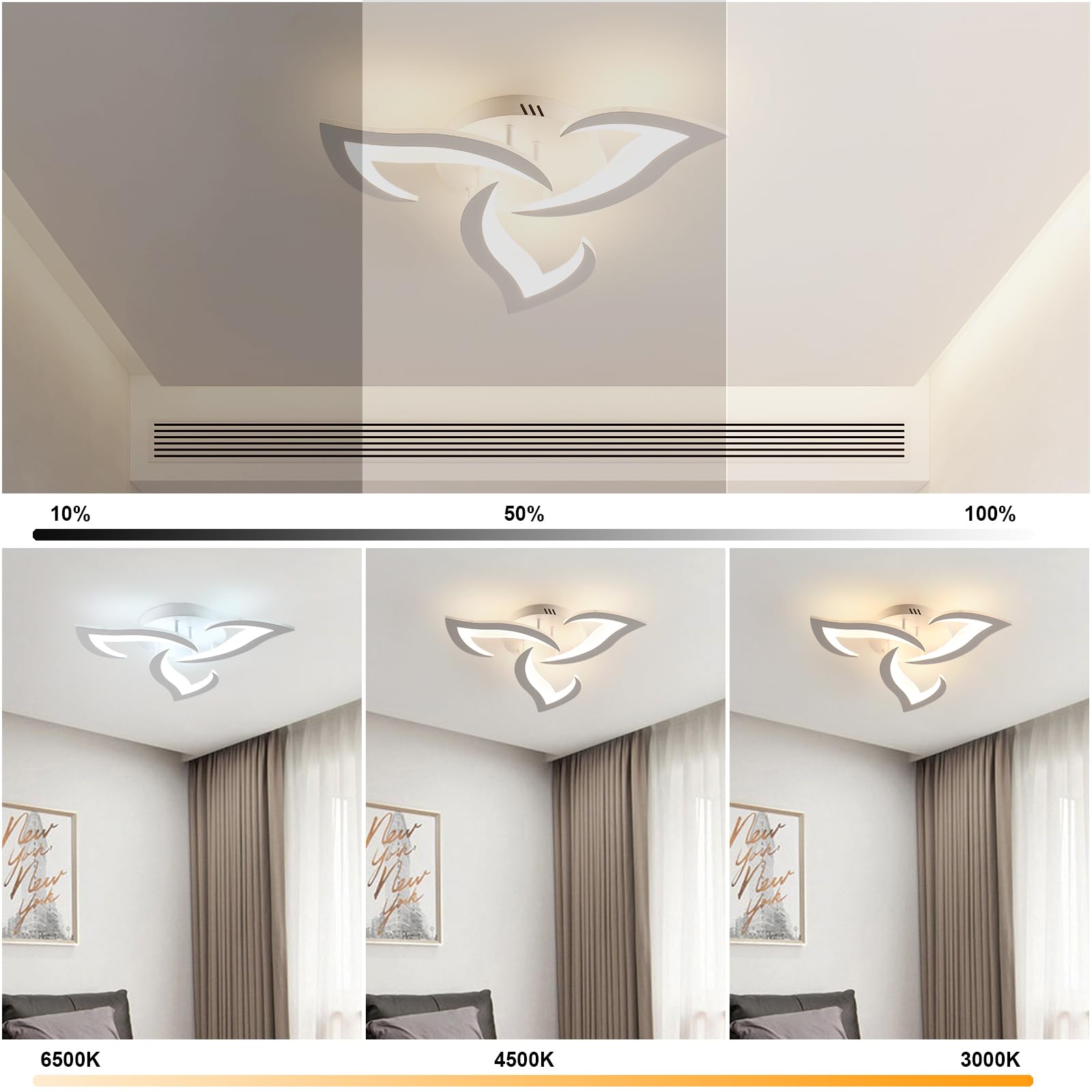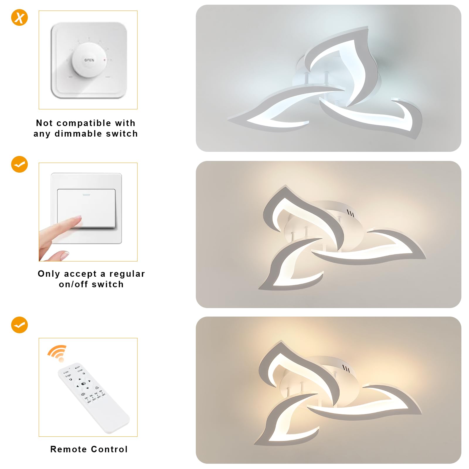 Comely LED-Deckenleuchte, dimmbar, moderne Acryl-Deckenlampe, 35 W, 3937 lm, 3000 K-6500 K, Deckenbeleuchtung mit Fernbedienung, für Schlafzimmer, Wohnzimmer, Durchmesser 58 cm, Weiss 【Spezifikation】 Dreiköpfige weisse Deckenleuchte Grösse: Durchmesser 58 x H 8 cm, Deckenplatte: 25 cm, Leistung: 35 W 3937 lm, Farbtemperatur: 3000 K-6500 K, Material: Aluminium und Acryl. Fernbedienung und stufenloses Dimmen: Diese moderne LED-Deckenleuchte ist dimmbar, und die Farbtemperatur und Helligkeit können per Schalter/Fernbedienung eingestellt werden. Sie kann zwischen 6500 K kaltweiss und 3000 K warmweiss gedimmt werden, 10 % bis 100 % stufenloses Dimmen. Energiesparend und Augenschutz: Die dimmbare Deckenbeleuchtung verfügt über LED-Chips im Inneren, die bis zu 80 % Energie sparen als Glühlampen. Der CRI beträgt mehr als 80 Ra und der hohe Farbwiedergabeindex zeigt eine gute Darstellung der wahren Farbe des Objekts, kein Flimmern. 【Einfach zu installieren】 Die LED-Deckenleuchte ist einfach zu installieren gemäss unserer Installationsanweisung, enthält alle Zubehörteile. 【Breite Anwendung】Das weiche Licht schützt Ihre Augen beim Lesen und anderen Aktivitäten. Perfekt für allgemeine Innenbereiche, wie Wohnzimmer, Schlafzimmer, Esszimmer, Restaurant, Bibliothek und Lesesaal.