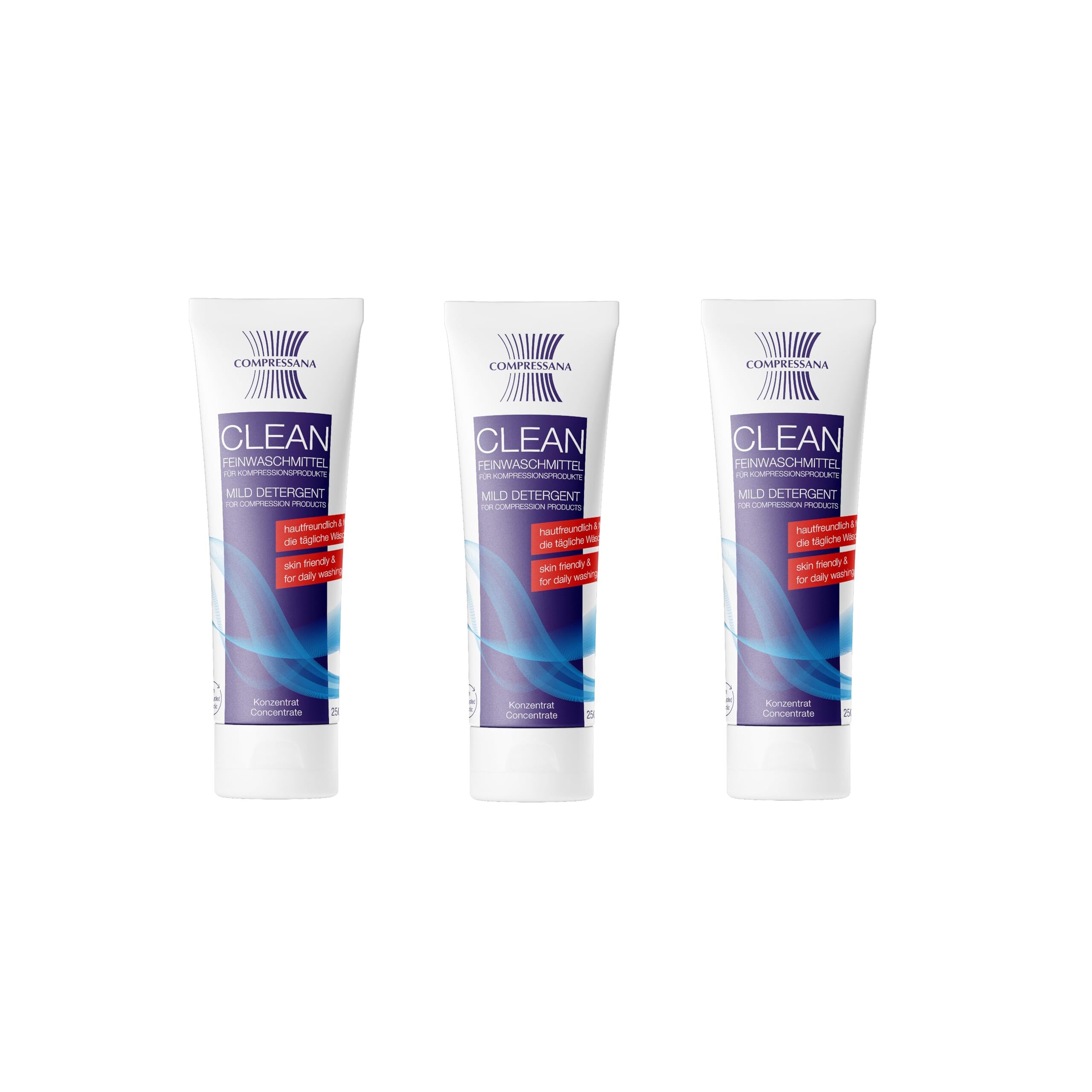 COMPRESSANA Clean - Fein-Waschmittel für Stütz- und Kompressionsstrümpfe, Bandagen, hochwertige Textilien - 3er Pack - besonders sanft zu Haut und Gestrick - 3 x 250 ml Konzentrat