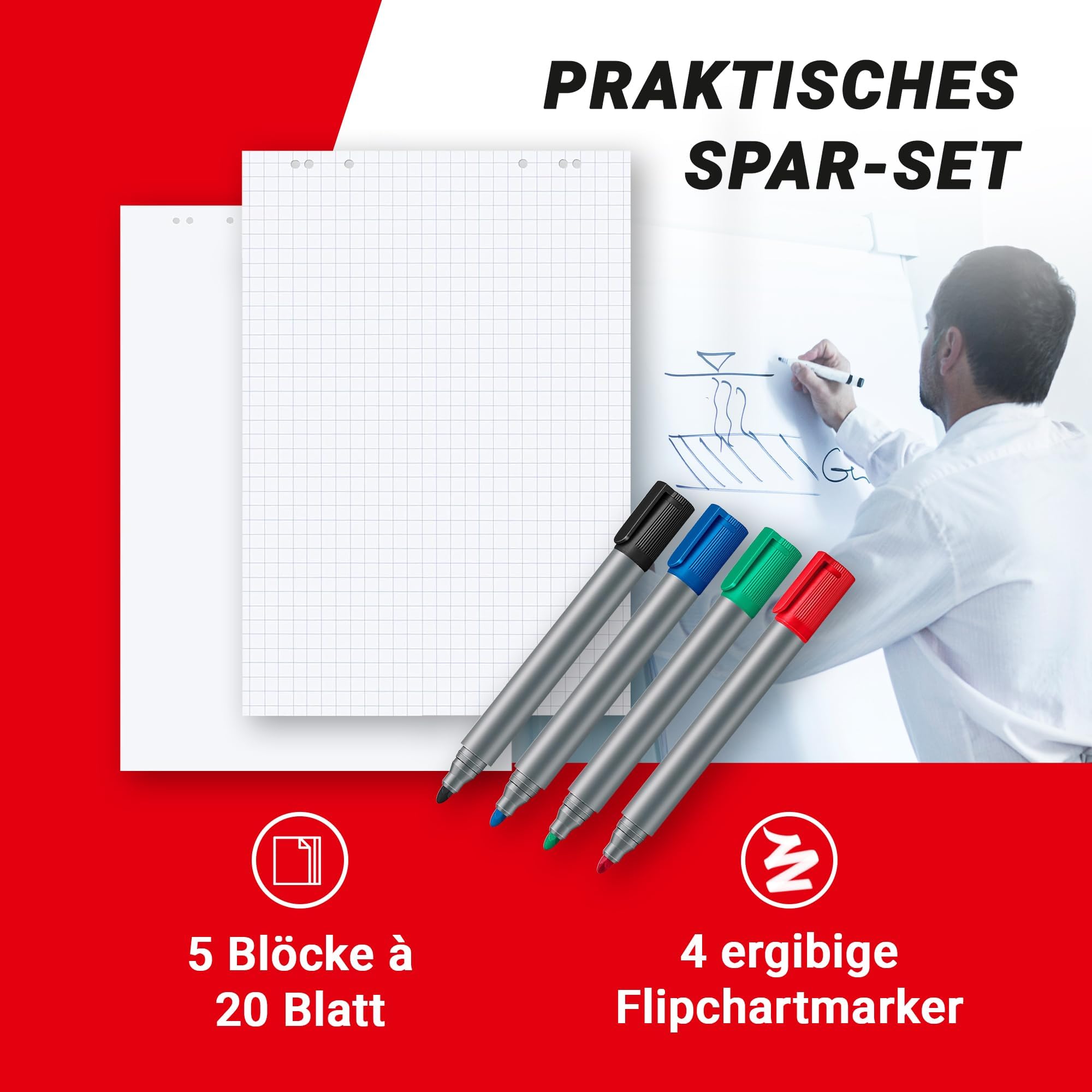 Conipa® - 5 x Set Flipchart Papier Block 68x99 cm weiss (KARIERT) 80 g/qm - 5 Blöcke à 20 Blatt INKL. 4 x Flipchart-Stifte (Marker) - Whiteboard-Papier & Blöcke - Board Paper für Charts & Meetings