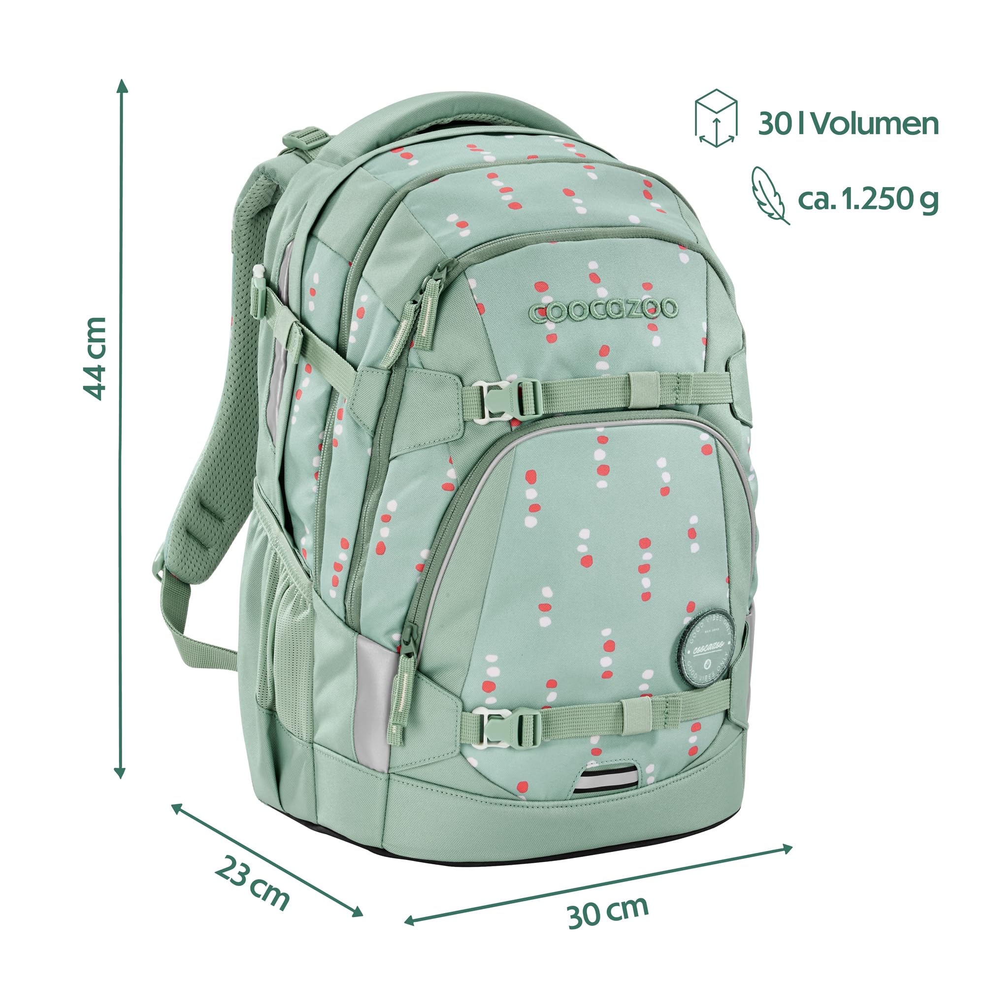 Der ideale Begleiter für alle Grundschüler und alle Teenager in der weiterführenden Schule ist mit Klett-Patches und Anhängern individualisierbar. Der MATE kommt mit einem Gratis-Patch zu euch nach Hause. Unsere separat erhältlichen COLOUR UP-Sets geben dir die Möglichkeit, den Schulrucksack deines Kindes noch einzigartiger zu gestalten. Ergonomischer Tragekomfort: Mit dem EASY GROW SYSTEM lässt er sich schnell und einfach auf die aktuelle Rückenlänge deines Kindes einstellen. Ein einfacher Drehmechanismus mit entsprechender Skala ermöglicht die Höhenverstellung der Schulterträger. Das Gewicht lässt sich durch die Riemen auf Schulterhöhe und Kompressionsriemen an der Seite nah am Rücken verteilen.Der MATE bietet viel Stauraum für Bücher, Hefte und alltägliche Dinge. Genug Platz garantieren vier verschiedene Fächer. Das integrierte Bücherfach ist nah am Rücken platziert. So wird die Last optimal verteilt. In der geräumigen Fronttasche ist Platz für Snack Box & Co., die beiden Seitenfächer sind perfekt für Trinkflasche und Regenschirm geeignet. Zusätzlich ist die Vorderseite mit Gurtbändern ausgestattet, die Jacke, Helm oder Skateboard sicher verstauen. Diese Features – kombiniert mit 30 Litern Stauraum und nur 1.250 Gramm Gewicht (ohne abnehmbare Elemente, Gesamtgewicht 1.350g) – machen den MATE zum grossartigen Multitalent.Die vorhandenen Leuchtstreifen und reflektierende Flächen sorgen für mehr Sichtbarkeit im Strassenverkehr. Zusätzlich kann dein Kind am Schulrucksack ein weiteres LED-Stecklicht befestigen.Ein weiterer Pluspunkt: der Schulrucksack ist sozial verträglich (unsere Partner: amfori, humedica) und verantwortungsvoll produziert (bluesign-Systempartner). Die coocazoo Modelle MATE, PORTER, JOKER sind mit dem AGR-Gütesiegel (Aktion Gesunder Rücken e.V.) ausgezeichnet.Hochwertig, praktisch und langlebig: Das ist der Schulrucksack MATE von coocazoo!