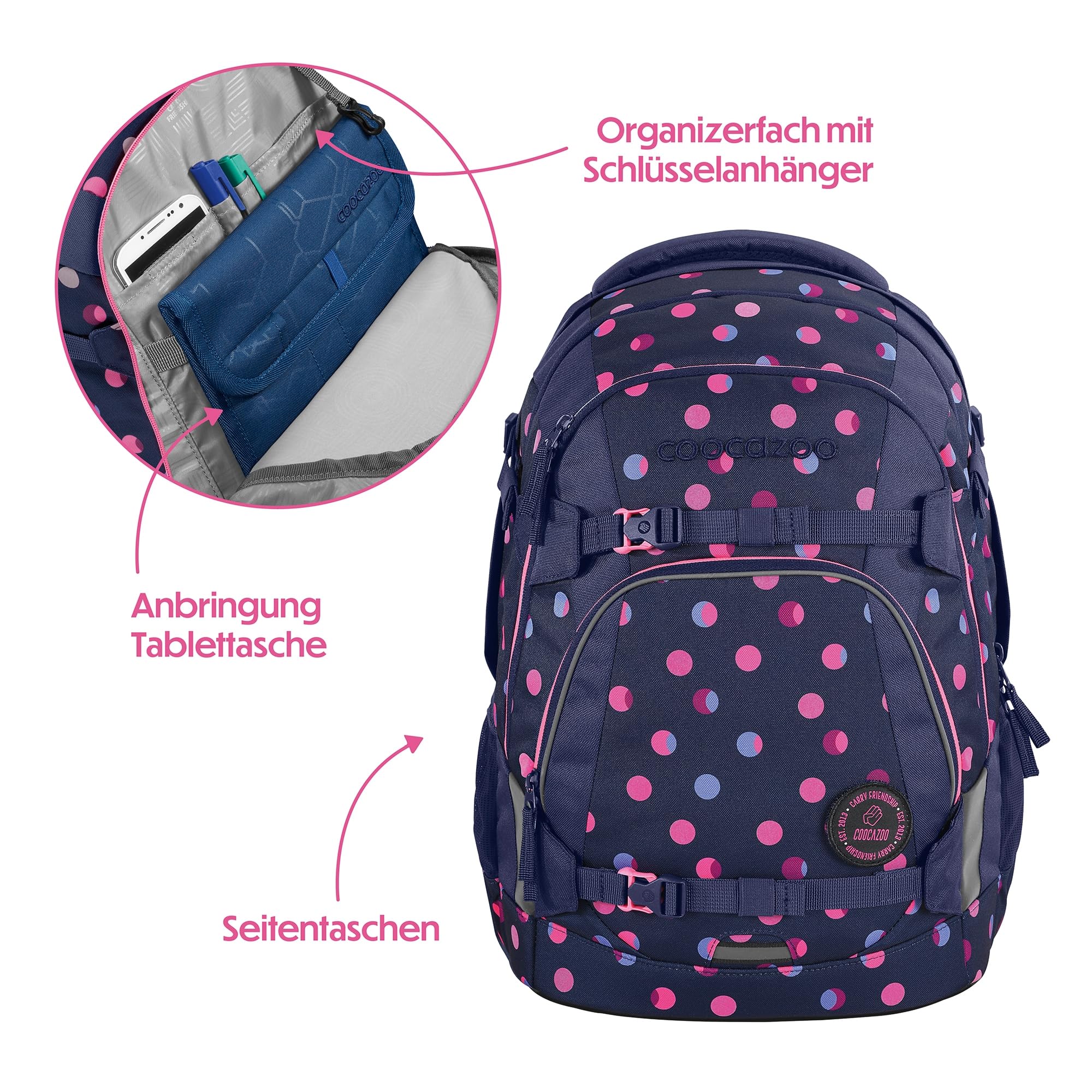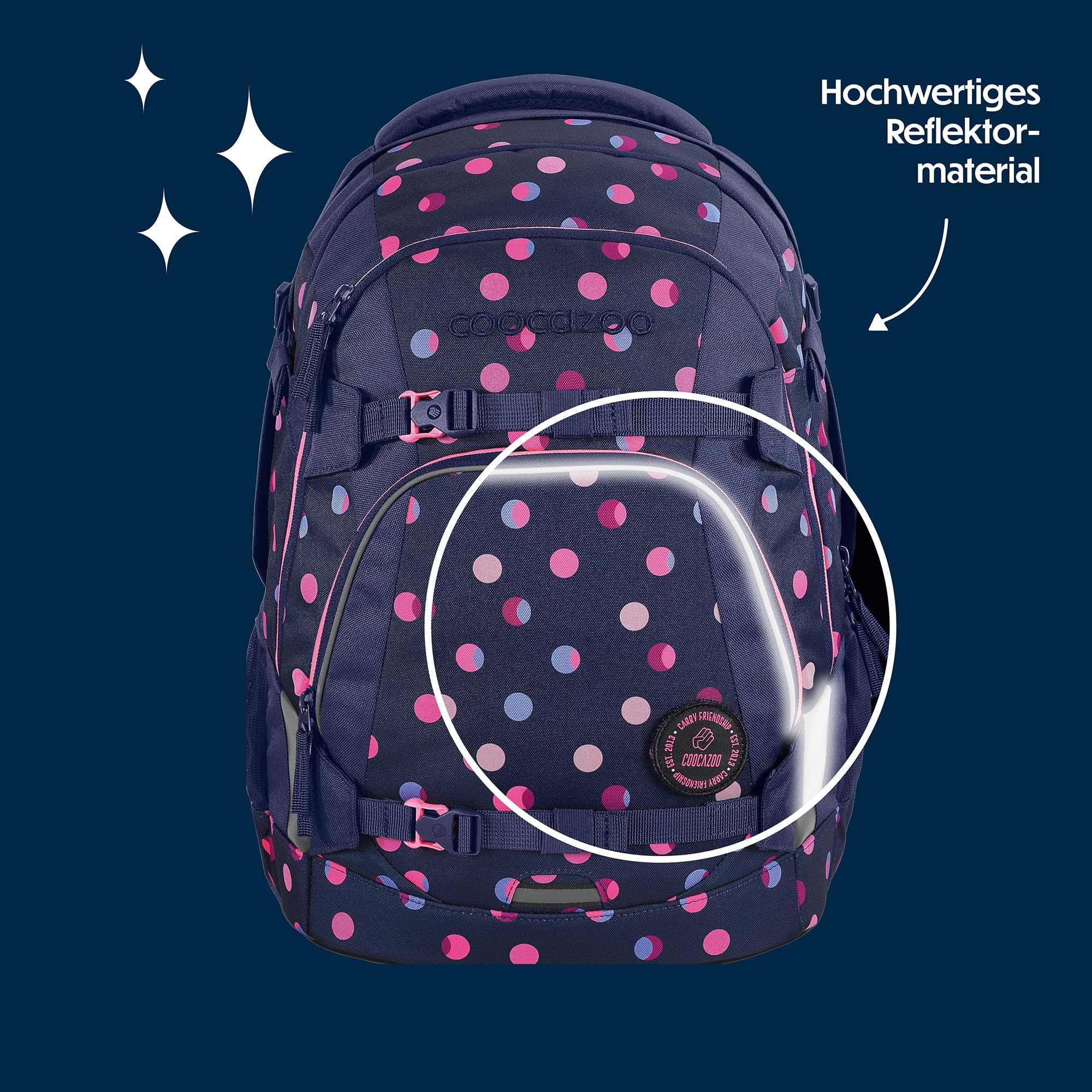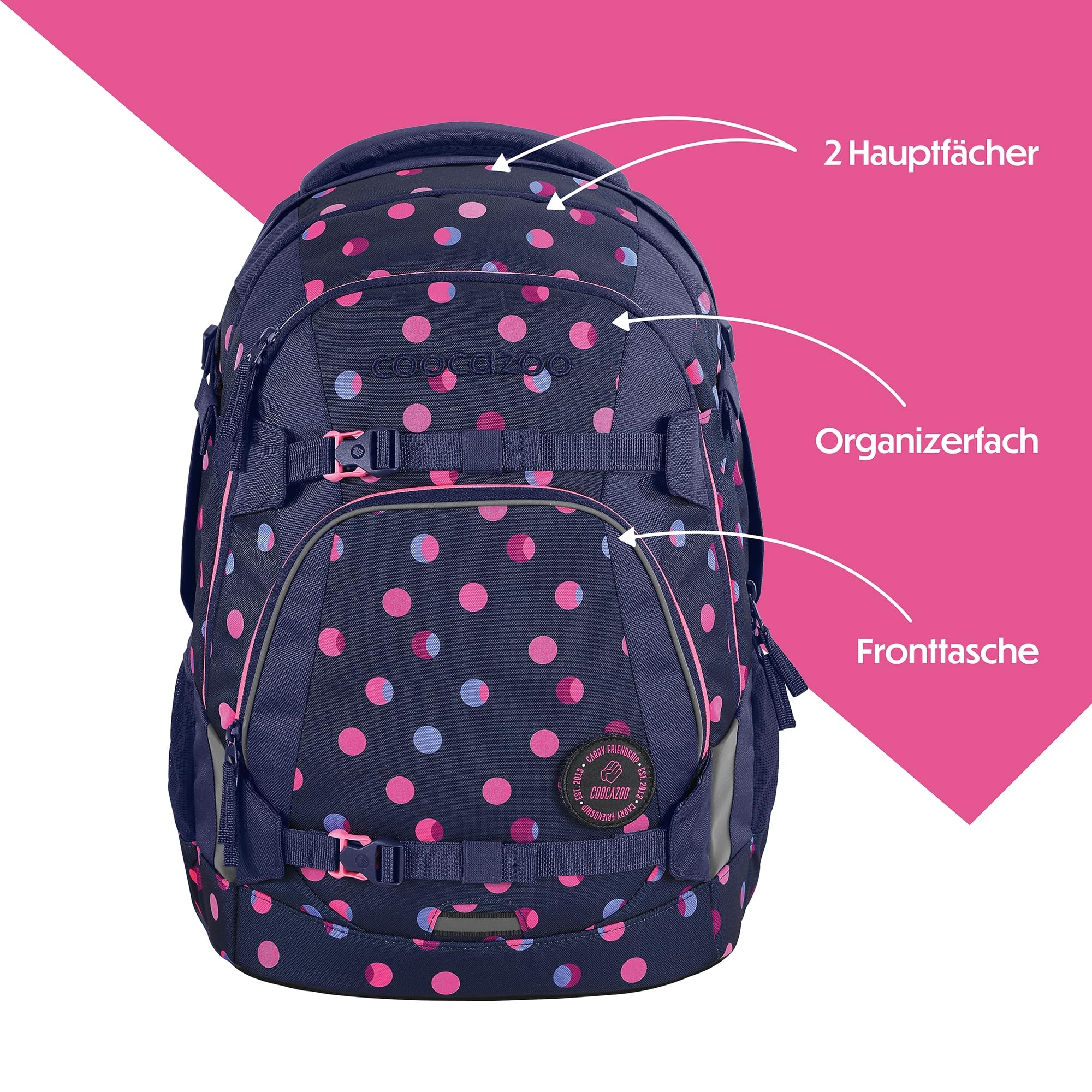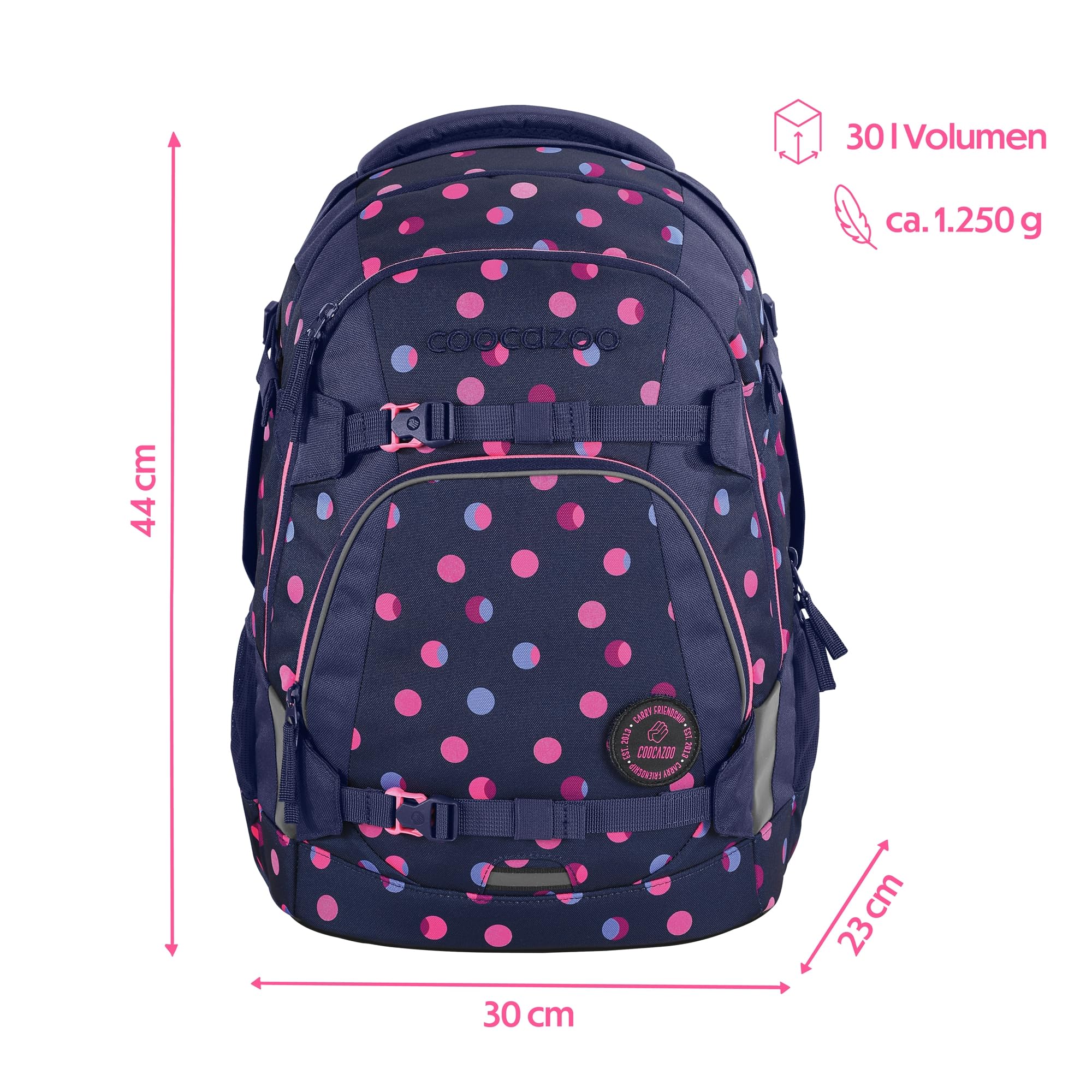 Der ideale Begleiter für alle Grundschüler und alle Teenager in der weiterführenden Schule ist mit Klett-Patches und Anhängern individualisierbar. Der MATE kommt mit einem Gratis-Patch zu euch nach Hause. Unsere separat erhältlichen COLOUR UP-Sets geben dir die Möglichkeit, den Schulrucksack deines Kindes noch einzigartiger zu gestalten. Ergonomischer Tragekomfort: Mit dem EASY GROW SYSTEM lässt er sich schnell und einfach auf die aktuelle Rückenlänge deines Kindes einstellen. Ein einfacher Drehmechanismus mit entsprechender Skala ermöglicht die Höhenverstellung der Schulterträger. Das Gewicht lässt sich durch die Riemen auf Schulterhöhe und Kompressionsriemen an der Seite nah am Rücken verteilen.Der MATE bietet viel Stauraum für Bücher, Hefte und alltägliche Dinge. Genug Platz für dein Kind garantieren vier verschiedene Fächer. Das integrierte Bücherfach ist nah am Rücken platziert. So wird die Last optimal verteilt. In der geräumigen Fronttasche ist Platz für Snack Box & Co., die beiden Seitenfächer sind perfekt für Trinkflasche und Regenschirm geeignet. Zusätzlich ist die Vorderseite mit Gurtbändern ausgestattet, die Jacke, Helm oder Skateboard sicher verstauen. Diese Features – kombiniert mit 30 Litern Stauraum und nur 1.250 Gramm Gewicht (ohne abnehmbare Elemente, Gesamtgewicht 1.350g) – machen den MATE zum grossartigen Multitalent.Die vorhandenen Leuchtstreifen und reflektierende Flächen sorgen für mehr Sichtbarkeit im Strassenverkehr. Zusätzlich kann dein Kind am Schulrucksack ein weiteres LED-Stecklicht befestigen.Ein weiterer Pluspunkt: der Schulrucksack ist klimaneutral ausgeglichen sowie sozial verträglich (unsere Partner: amfori, humedica) und verantwortungsvoll produziert (bluesign-Systempartner). Die coocazoo Modelle MATE, PORTER, JOKER sind mit dem AGR-Gütesiegel (Aktion Gesunder Rücken e.V.) ausgezeichnet.Hochwertig, praktisch und langlebig: Das ist der Schulrucksack MATE von coocazoo!