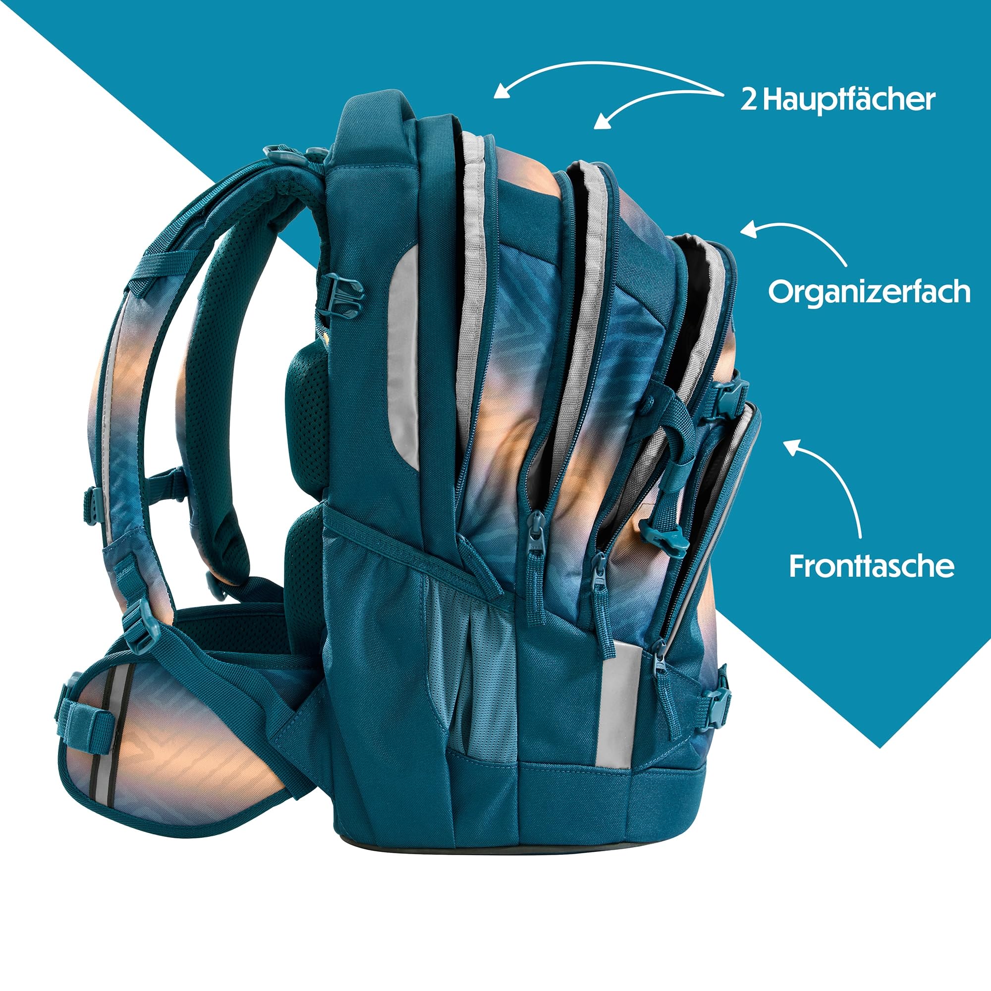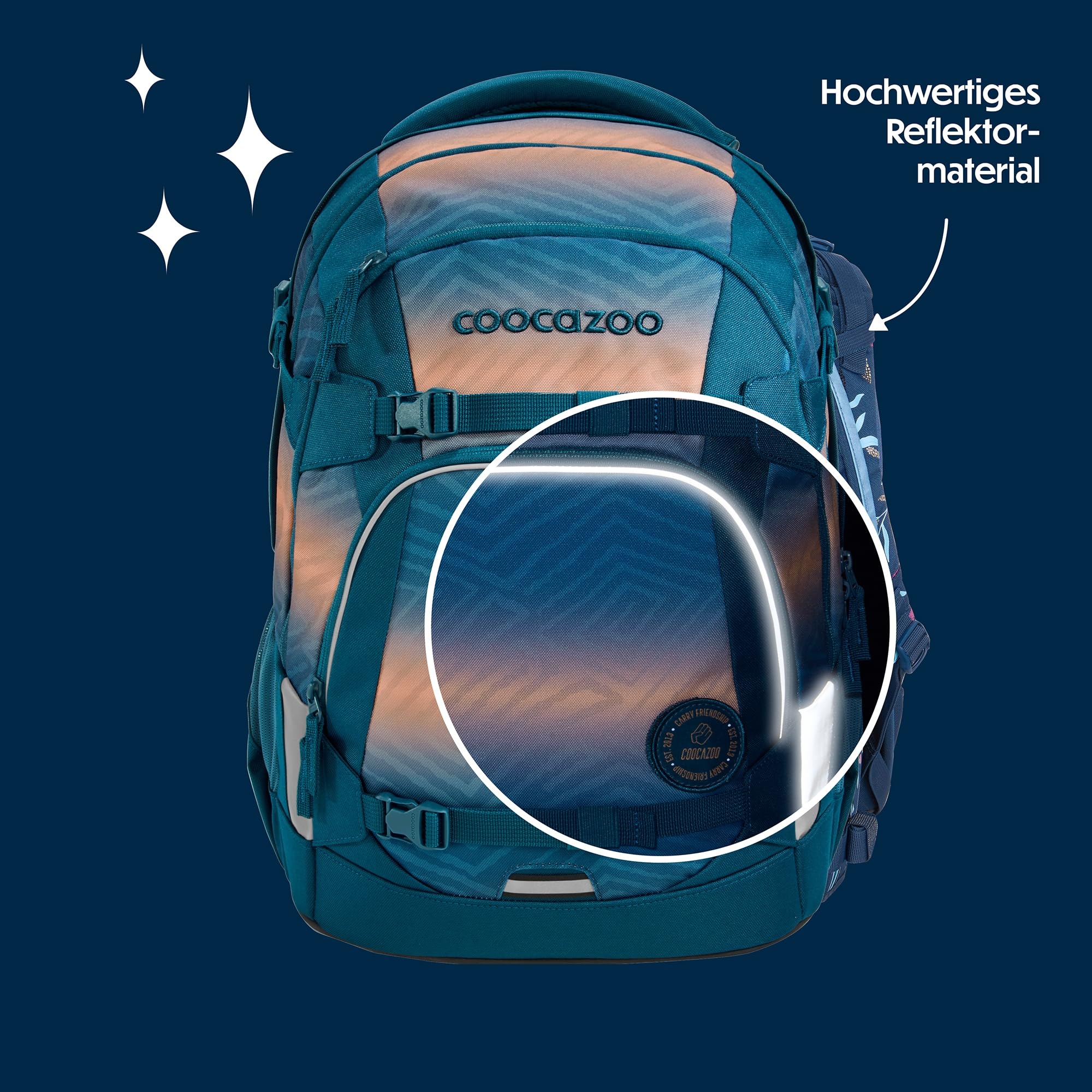 Der ideale Begleiter für alle Grundschüler und alle Teenager in der weiterführenden Schule ist mit Klett-Patches und Anhängern individualisierbar. Der MATE kommt mit einem Gratis-Patch zu euch nach Hause. Unsere separat erhältlichen COLOUR UP-Sets geben dir die Möglichkeit, den Schulrucksack deines Kindes noch einzigartiger zu gestalten. Ergonomischer Tragekomfort: Mit dem EASY GROW SYSTEM lässt er sich schnell und einfach auf die aktuelle Rückenlänge deines Kindes einstellen. Ein einfacher Drehmechanismus mit entsprechender Skala ermöglicht die Höhenverstellung der Schulterträger. Das Gewicht lässt sich durch die Riemen auf Schulterhöhe und Kompressionsriemen an der Seite nah am Rücken verteilen.Der MATE bietet viel Stauraum für Bücher, Hefte und alltägliche Dinge. Genug Platz garantieren vier verschiedene Fächer. Das integrierte Bücherfach ist nah am Rücken platziert. So wird die Last optimal verteilt. In der geräumigen Fronttasche ist Platz für Snack Box & Co., die beiden Seitenfächer sind perfekt für Trinkflasche und Regenschirm geeignet. Zusätzlich ist die Vorderseite mit Gurtbändern ausgestattet, die Jacke, Helm oder Skateboard sicher verstauen. Diese Features – kombiniert mit 30 Litern Stauraum und nur 1.250 Gramm Gewicht (ohne abnehmbare Elemente, Gesamtgewicht 1.350g) – machen den MATE zum grossartigen Multitalent.Die vorhandenen Leuchtstreifen und reflektierende Flächen sorgen für mehr Sichtbarkeit im Strassenverkehr. Zusätzlich kann dein Kind am Schulrucksack ein weiteres LED-Stecklicht befestigen.Ein weiterer Pluspunkt: der Schulrucksack ist sozial verträglich (unsere Partner: amfori, humedica) und verantwortungsvoll produziert (bluesign-Systempartner). Die coocazoo Modelle MATE, PORTER, JOKER sind mit dem AGR-Gütesiegel (Aktion Gesunder Rücken e.V.) ausgezeichnet.Hochwertig, praktisch und langlebig: Das ist der Schulrucksack MATE von coocazoo!